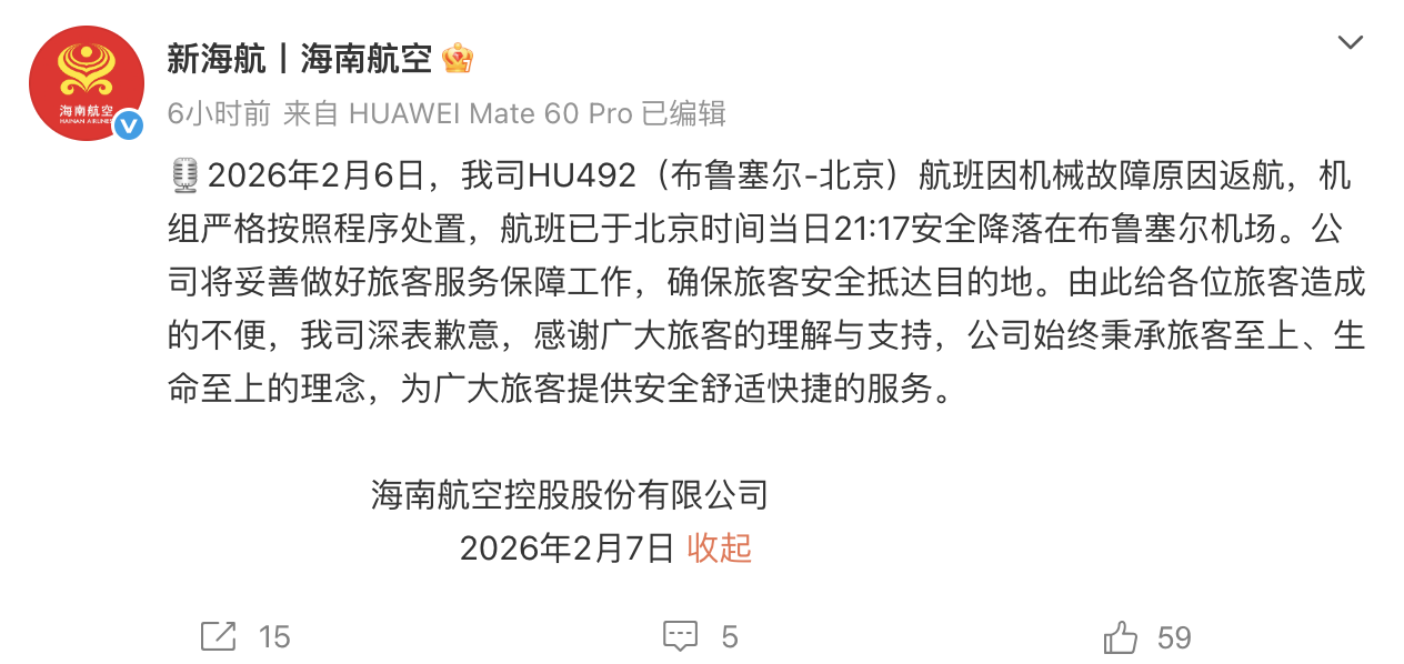 【點新聞報道】海南航空今日(7日)通報,其一架從比利時布魯塞爾飛往北京的航班(航班號HU492,機型波音787)在昨日起飛後發生機械故障,於當晚9時左右安全返航,降落在布魯塞爾機場。公司強調始終將乘客安全置於首位,將全力保障旅客後續抵達目的地,並就此事給旅客帶來的不便深表歉意。