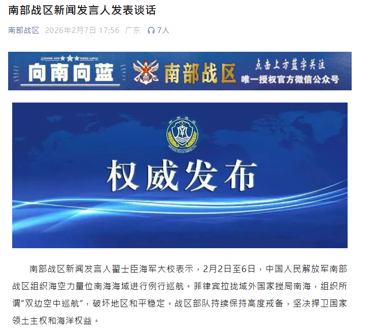 【點新聞報道】據南部戰區微信公眾號2月7日消息,南部戰區新聞發言人發表談話。