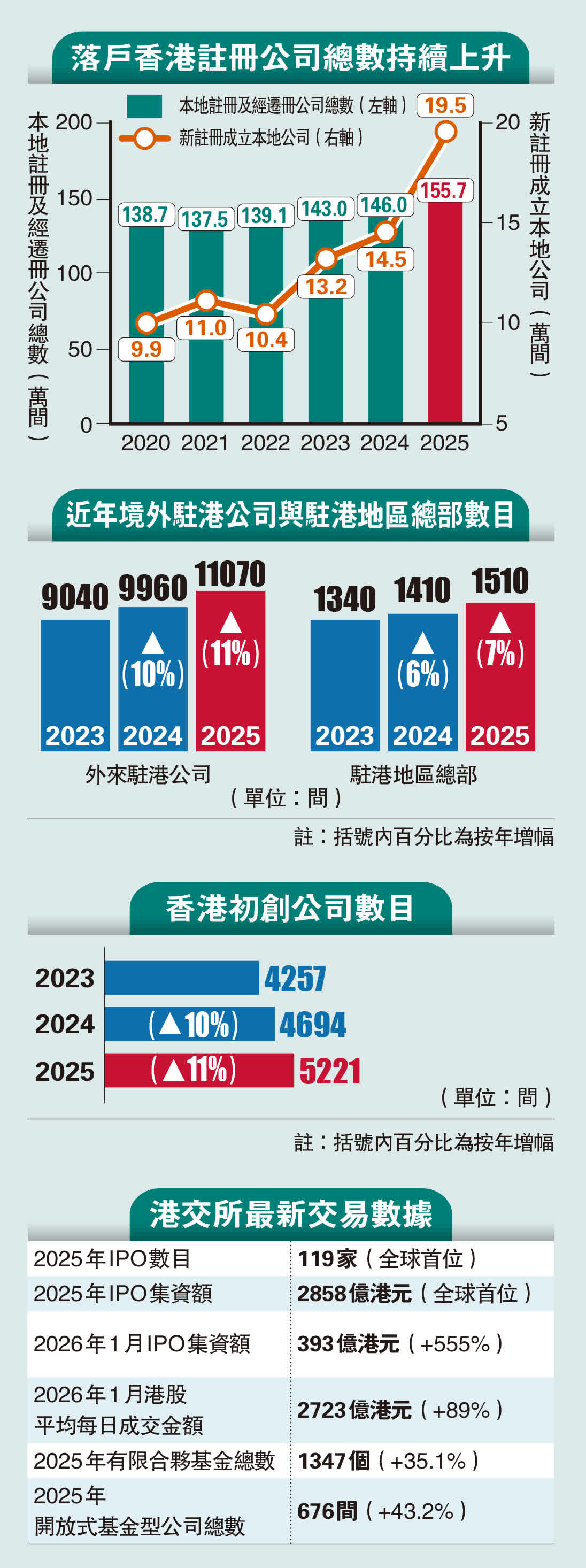 香港特區政府早前也公布,去年母公司在內地及海外的駐港公司數目增加至1.1萬間,而香港的初創企業數目則增至5221間。兩項數字均再創新高,顯示香港對全球企業的獨特吸引力持續增加,是他們設立或擴展業務的理想投資目的地。投資推廣署去年招商引資工作亦取得佳績,共協助560間海外及內地企業在港開設或擴展業務,較2024年上升超過4%,數目同創新高。