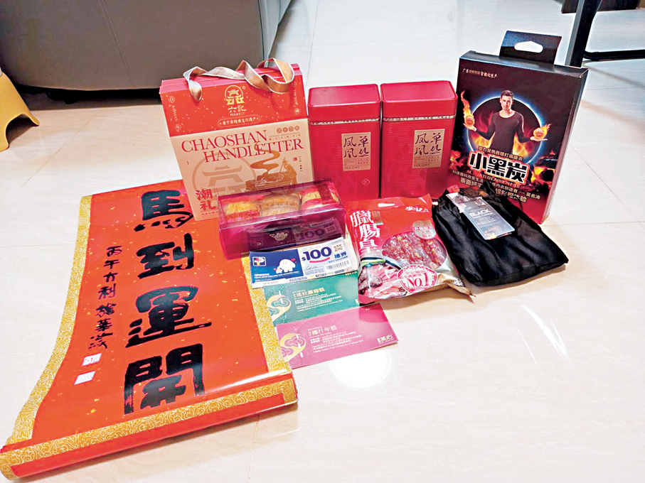 他提到,近期有收到不少機構贈送新春福袋或請吃大餐,例如早前有商會派發新春福袋,當中有超市與賀年糕點禮券,還有臘腸、蝦子麵、茶具禮盒、揮春等,非常豐富,估計總值逾3,000元;另亦有機構於年初八請宏福苑居民食新春午宴,3月初過年後亦有機構請居民到酒樓食大餐,每人只收20元報名費,菜式豐富。對於社會中那麼多人在幫助宏福苑居民,他感到感恩以及開心。