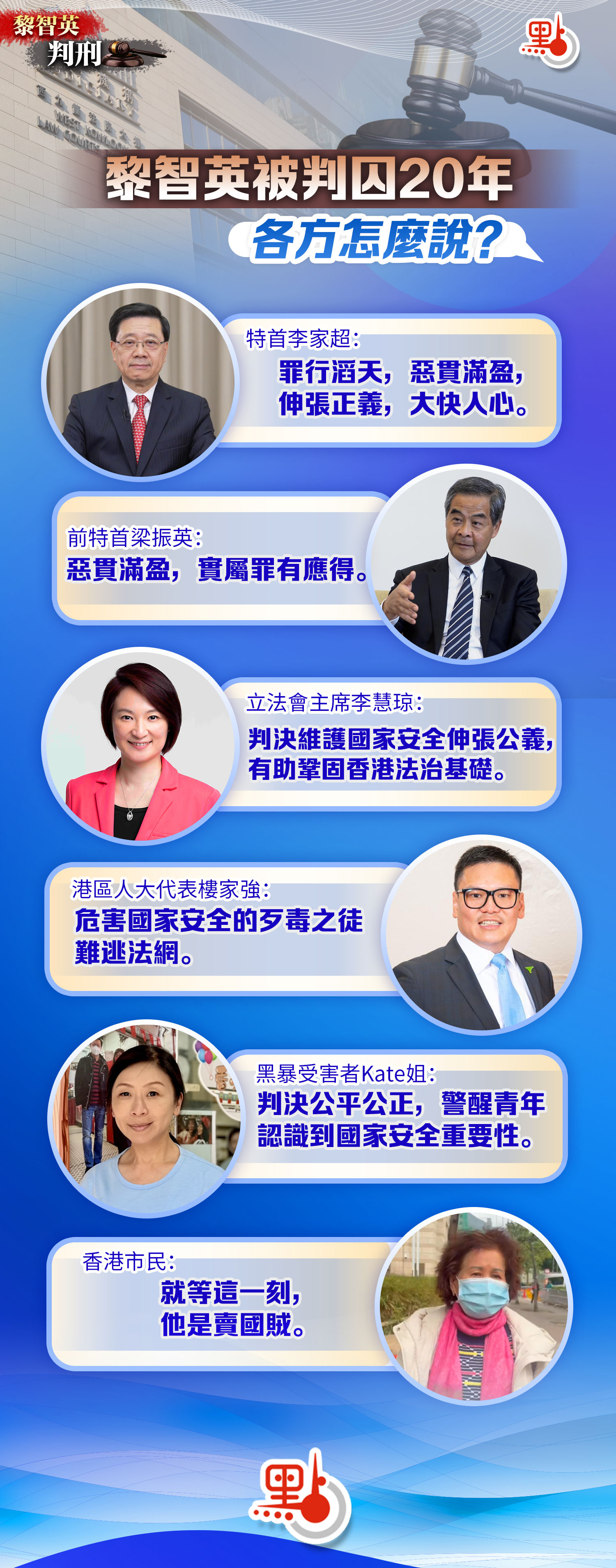 【點新聞報道】156天公開聆訊、警方呈堂證物2222項、文件冊超過8萬頁紙、法庭裁決理由書共855頁……鐵證如山,黎智英串謀勾結外國勢力案今日(9日)判刑,黎智英被判20年監禁。