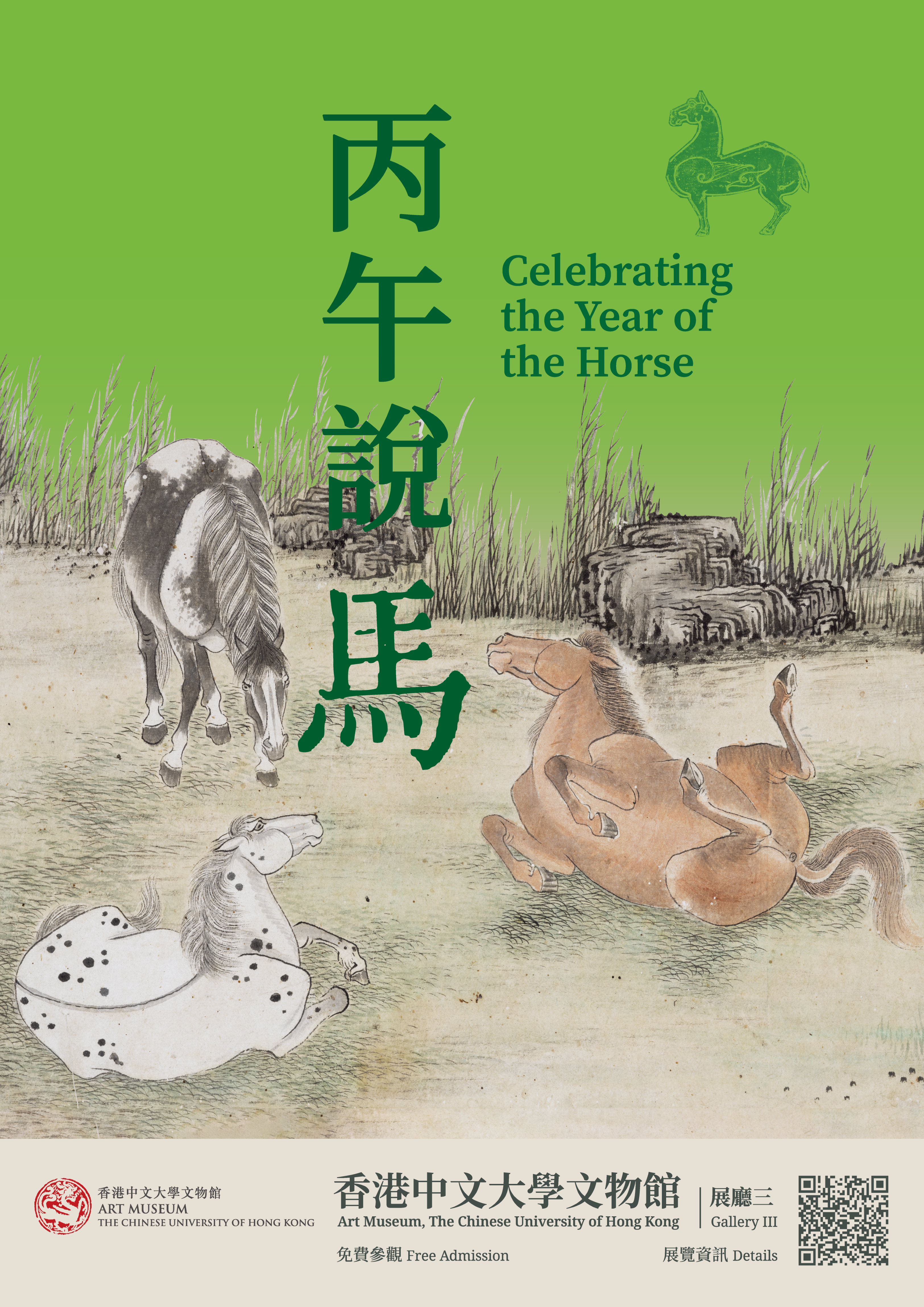 展品選取四十餘組與馬相關的館藏,重點展品包括巨製《百駿圖》、清代著名畫家張穆的《滾塵圖》和《臥馬》、嶺南畫派創始人之一高劍父的《風雨驊騮》,以及新增館藏尹瘦石的《奔馬》。