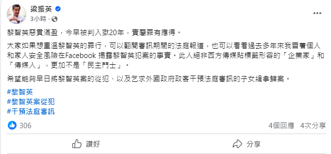 梁振英在社交平台發文指,黎智英絕非西方傳媒貼標籤形容的「企業家」和「傳媒人」,更加不是「民主鬥士」,他希望當局能夠早日將黎智英案的從犯、以及乞求外國政府政客干預法庭審訊的子女緝拿歸案。