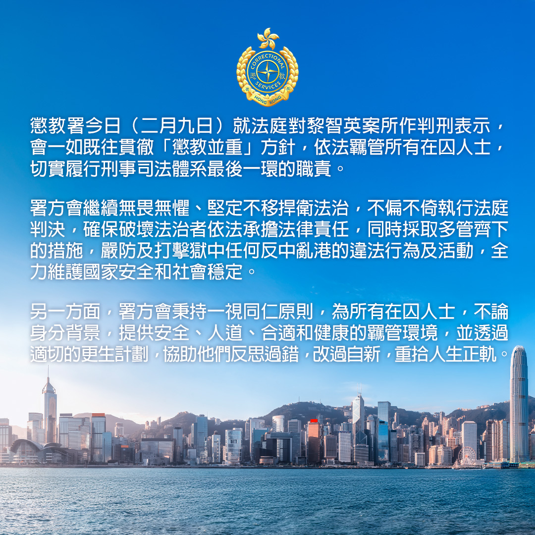 懲教署表示,會繼續無畏無懼、堅定不移捍衛法治,不偏不倚執行法庭判決,確保破壞法治者依法承擔法律責任,同時採取多管齊下的措施,嚴防及打擊獄中任何反中亂港的違法行為及活動,全力維護國家安全和社會穩定。