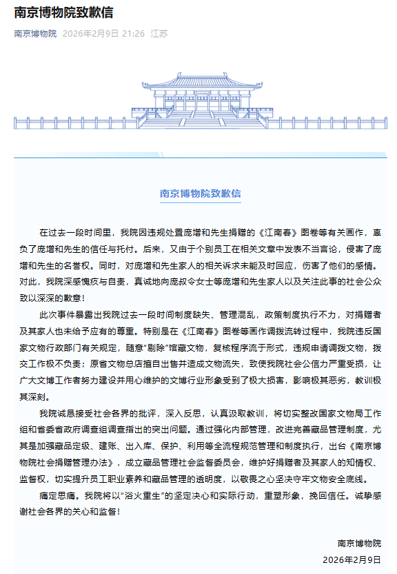 2月9日,南京博物院發布致歉信,全文如下:
