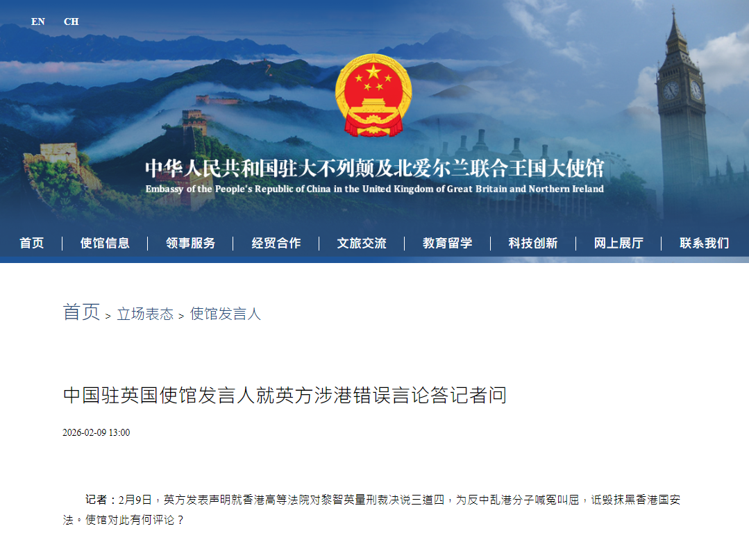 【點新聞報道】2月9日,英方發表聲明就香港高等法院對黎智英量刑裁決說三道四,為反中亂港分子喊冤叫屈,詆毀抹黑香港國安法。對此,中國駐英國使館發言人表示,堅決反對英方錯誤言論,敦促英方尊重中國司法主權,停止干涉香港法治,停止干涉中國內政。