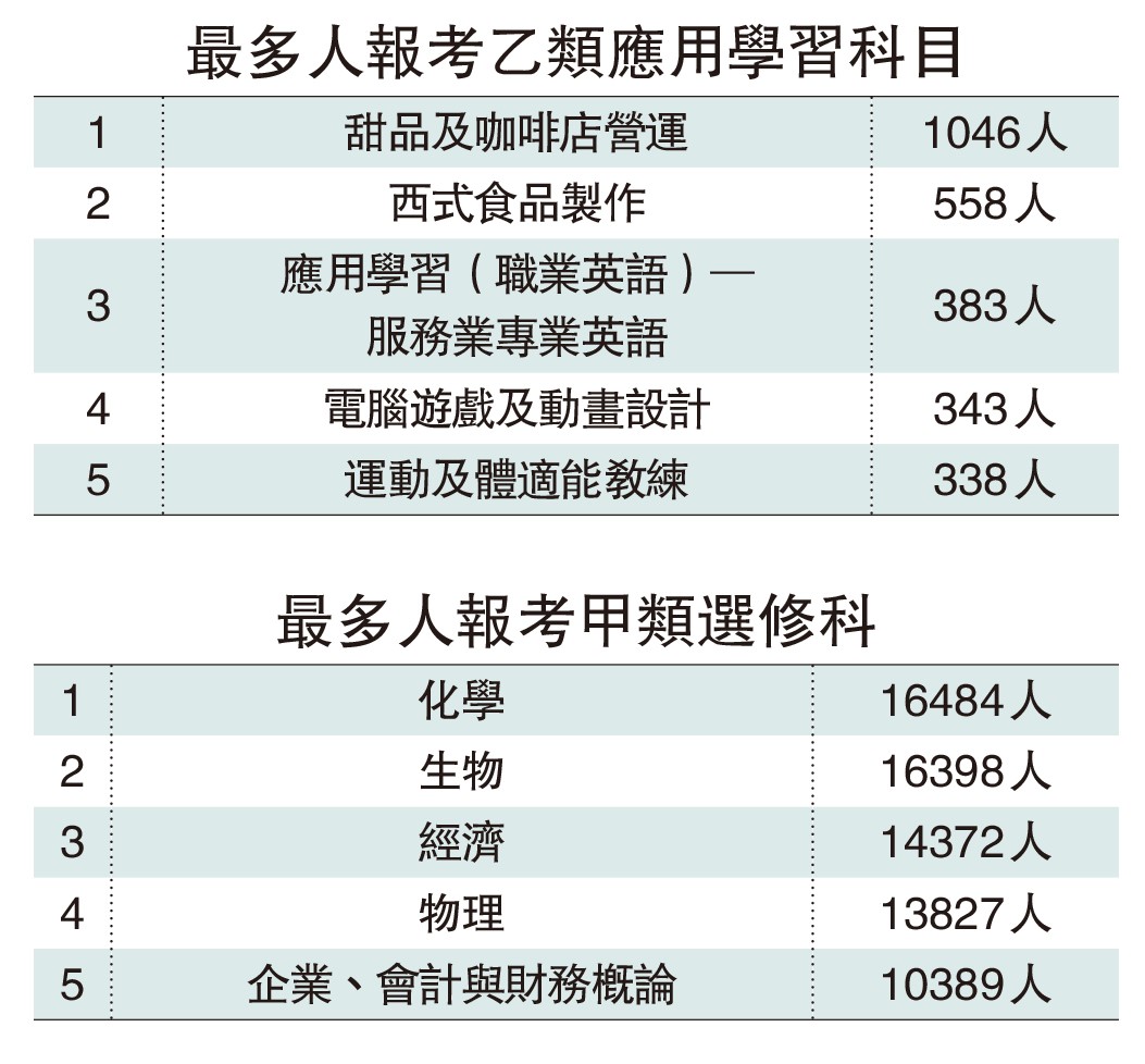在甲類選修科目中,最多學校考生報考的科目為化學,有16484人,其次為生物共16398人。今年共有59個乙類應用學習科目,共有7836名考生報考,最多人報考科目為甜品及咖啡店營運,共有1046人。