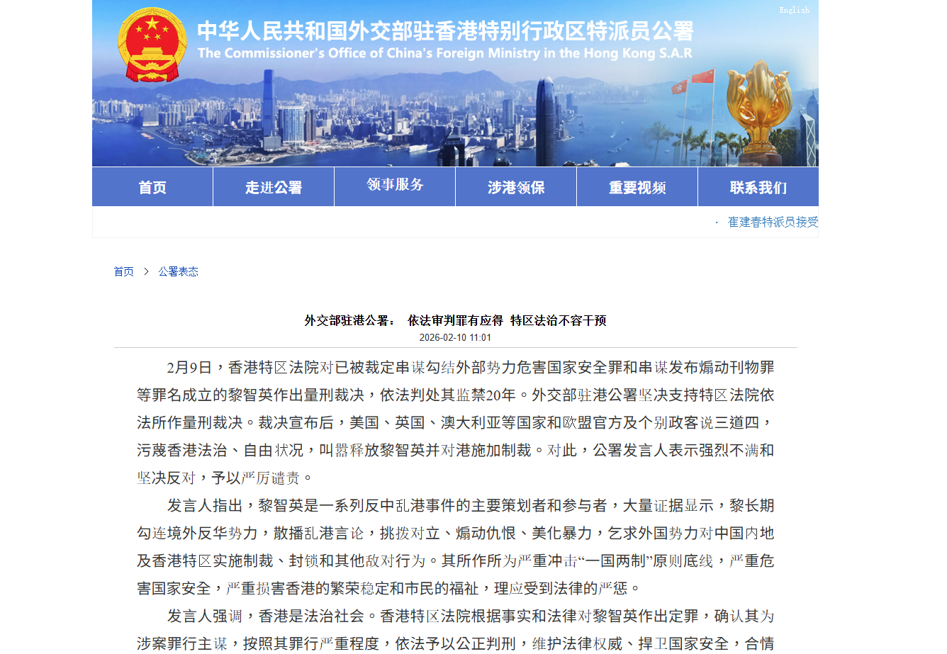 2月9日,香港特區法院對已被裁定串謀勾結外部勢力危害國家安全罪和串謀發布煽動刊物罪等罪名成立的黎智英作出量刑裁決,依法判處其監禁20年。外交部駐港公署堅決支持特區法院依法所作量刑裁決。裁決宣布後,美國、英國、澳大利亞等國家和歐盟官方及個別政客說三道四,污衊香港法治、自由狀況,叫囂釋放黎智英並對港施加制裁。對此,公署發言人表示強烈不滿和堅決反對,予以嚴厲譴責。
