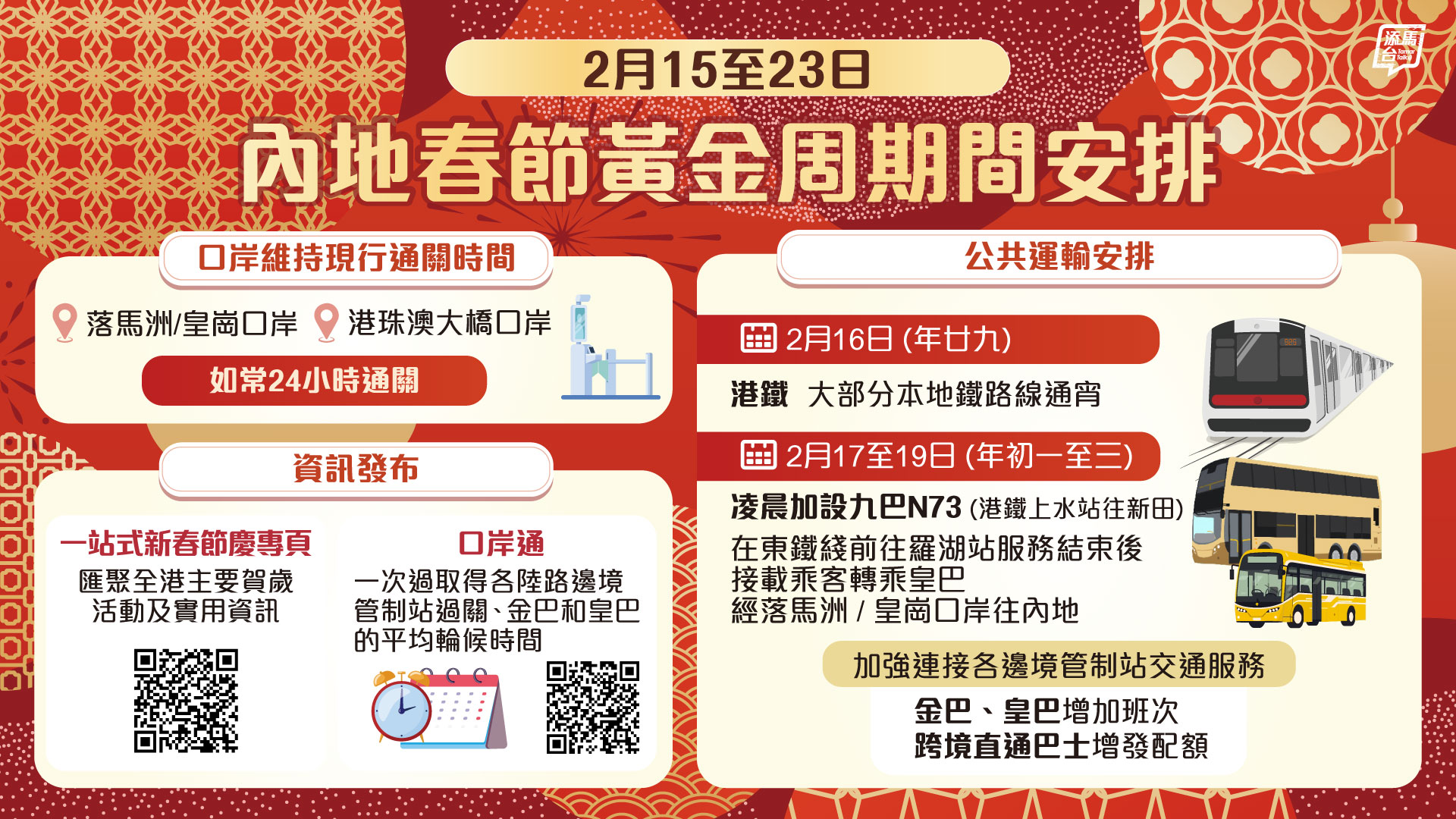 市民可於一站式新春節慶專頁查看新春節慶活動;於一站式過關資訊平台「口岸通」查看各口岸實時平均輪候情況,資料約每15分鐘更新一次,並反映更新時的評估狀況。