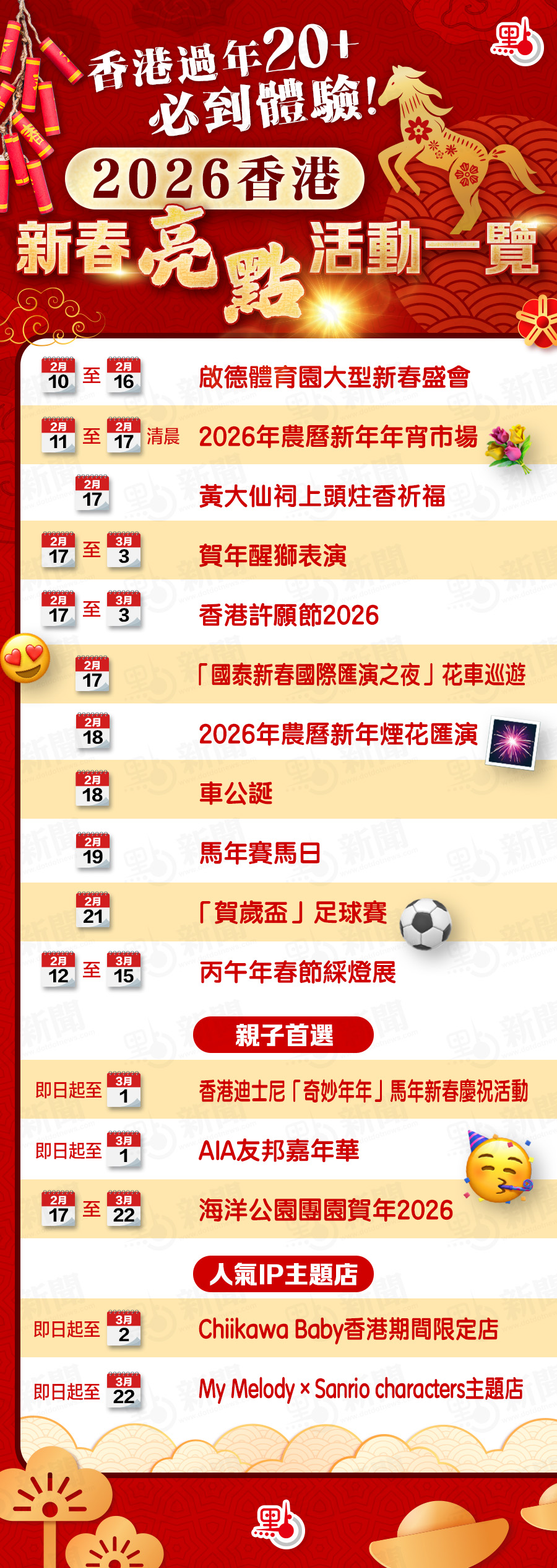 李家超介紹,2月11日全港14個年宵市場開幕,2月12日香港綵燈展在尖沙咀露天廣場舉行,年初一舉行新春國際匯演之夜,年初二至正月十五,香港各區舉行花車巡遊;年初二的農曆新年煙花匯演,長達23分鐘的煙花在維港上空綻放;年初三馬年賽馬日;年初五香港大球場賀歲盃足球賽。此外,大埔林村許願節,黃大仙祠車公廟亦有不同活動。