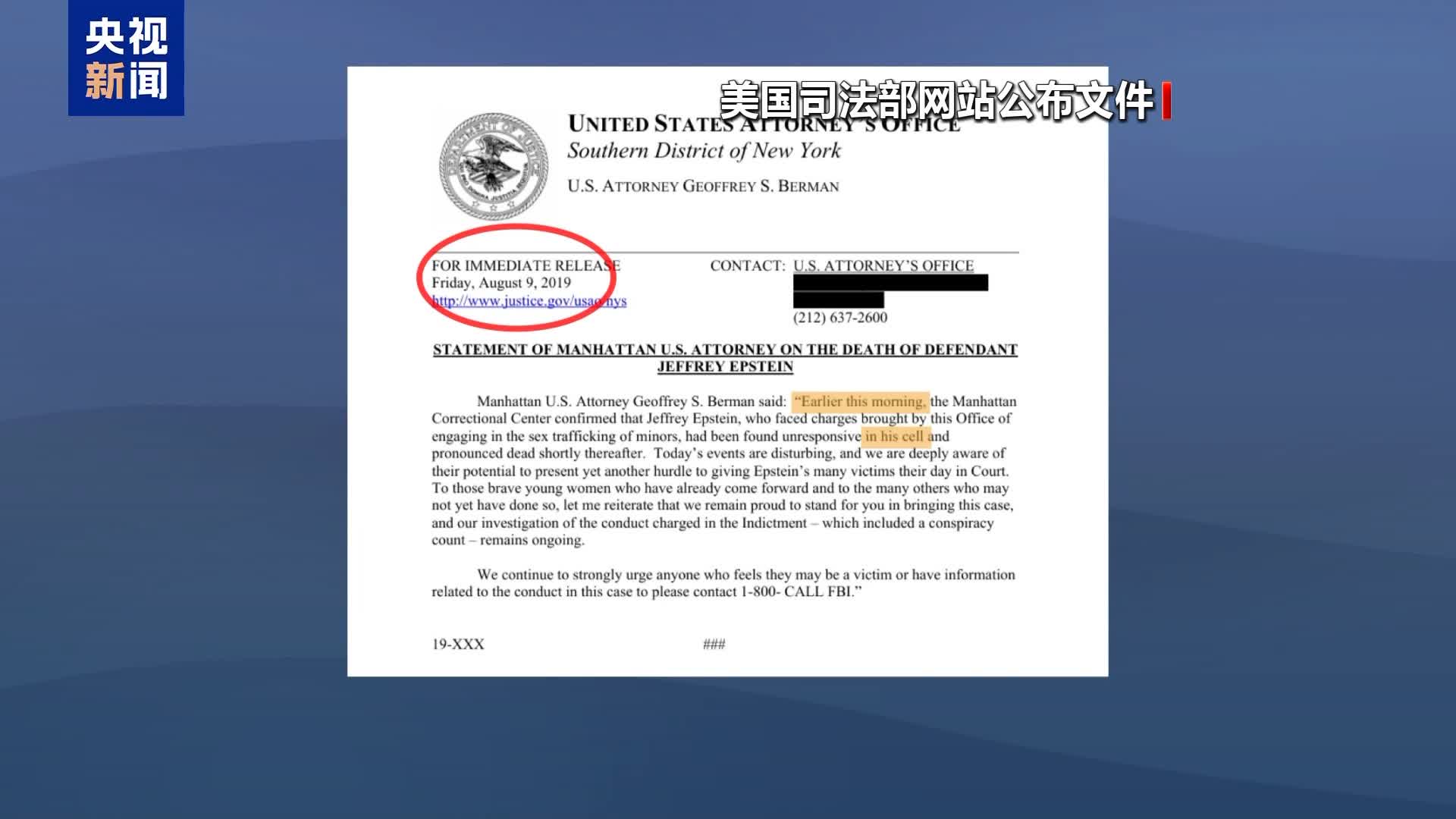 此外,有消息顯示,上月底公布的文件中,還有美國紐約南區聯邦檢察官辦公室的死亡聲明草稿,內容是愛潑斯坦於「今天早間」「在其牢房中」身亡,日期赫然寫着「2019年8月9日」,也就是愛潑斯坦死亡的前一天。與後來公布的正式聲明不同,這個「早產」的聲明草稿沒有提及「疑似自殺」的字樣,僅模糊表述為愛潑斯坦「不省人事,隨後被宣告死亡」。