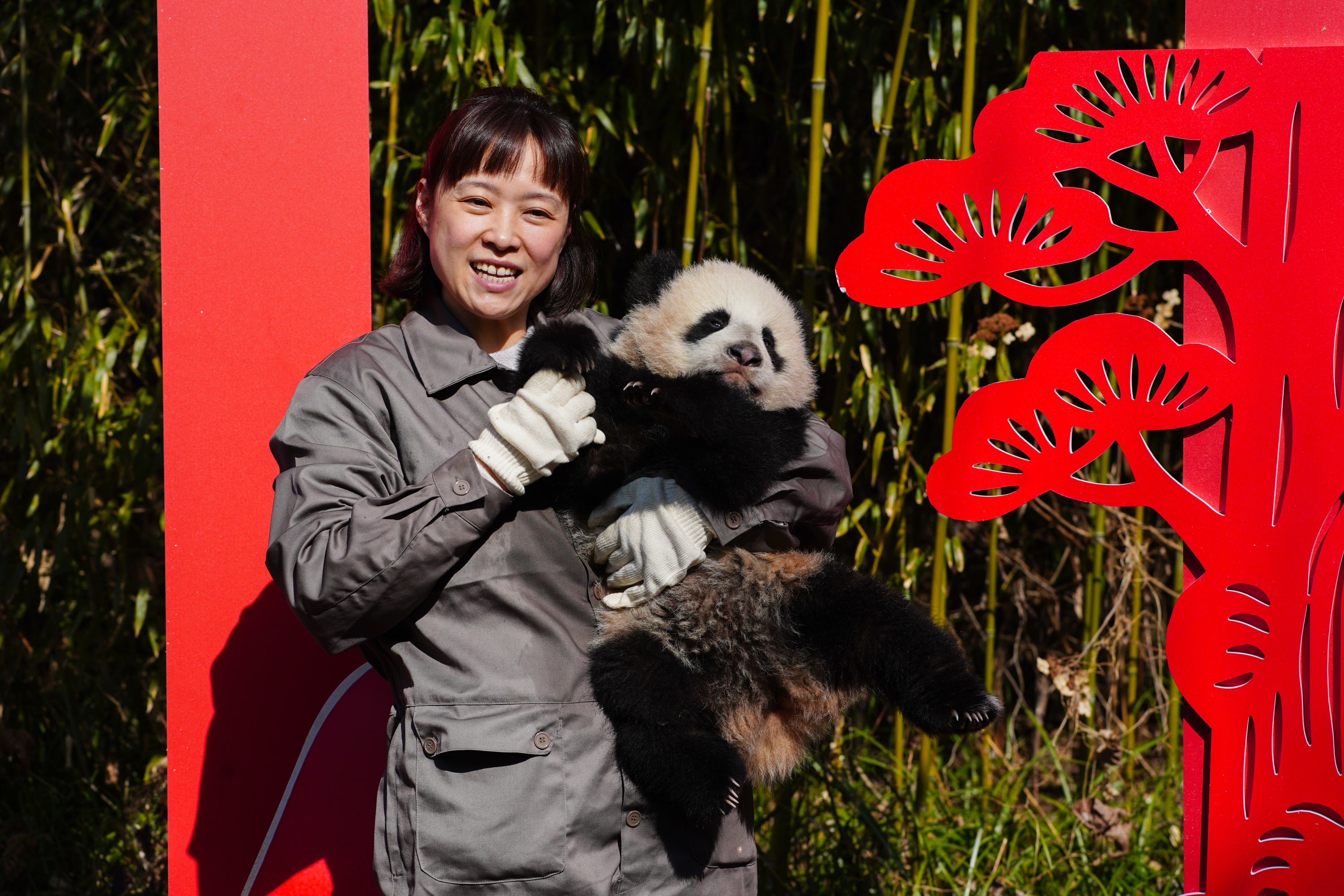展位上布置了寫滿新春祝福的竹節,寓意團圓的竹編,還有木馬列車等丰容設施,這些設施不僅為熊貓寶寶帶來新的丰容體驗,也進一步烘托出溫馨的節日氛圍。