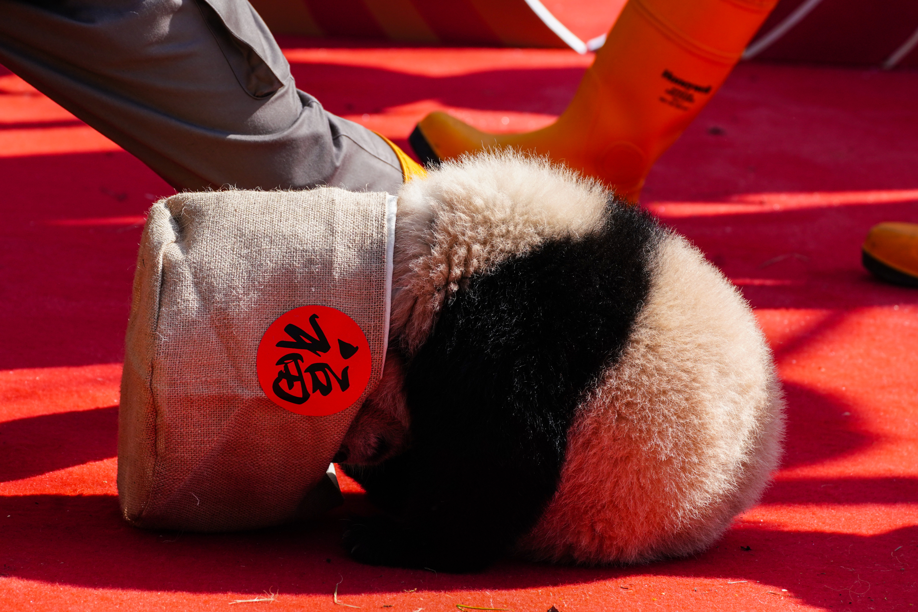 最為吸睛的是飼養員們懷抱熊貓寶寶登場環節,隨着熊貓寶寶們依次亮相,瞬間點燃全場。活潑可愛的小傢伙們各展萌態,有的走近竹編燈籠好奇張望,有的鑽進麻布福袋探出腦袋,有的騎上木馬玩得不亦樂乎,一幅生動的「新春萌趣圖」躍然眼前。