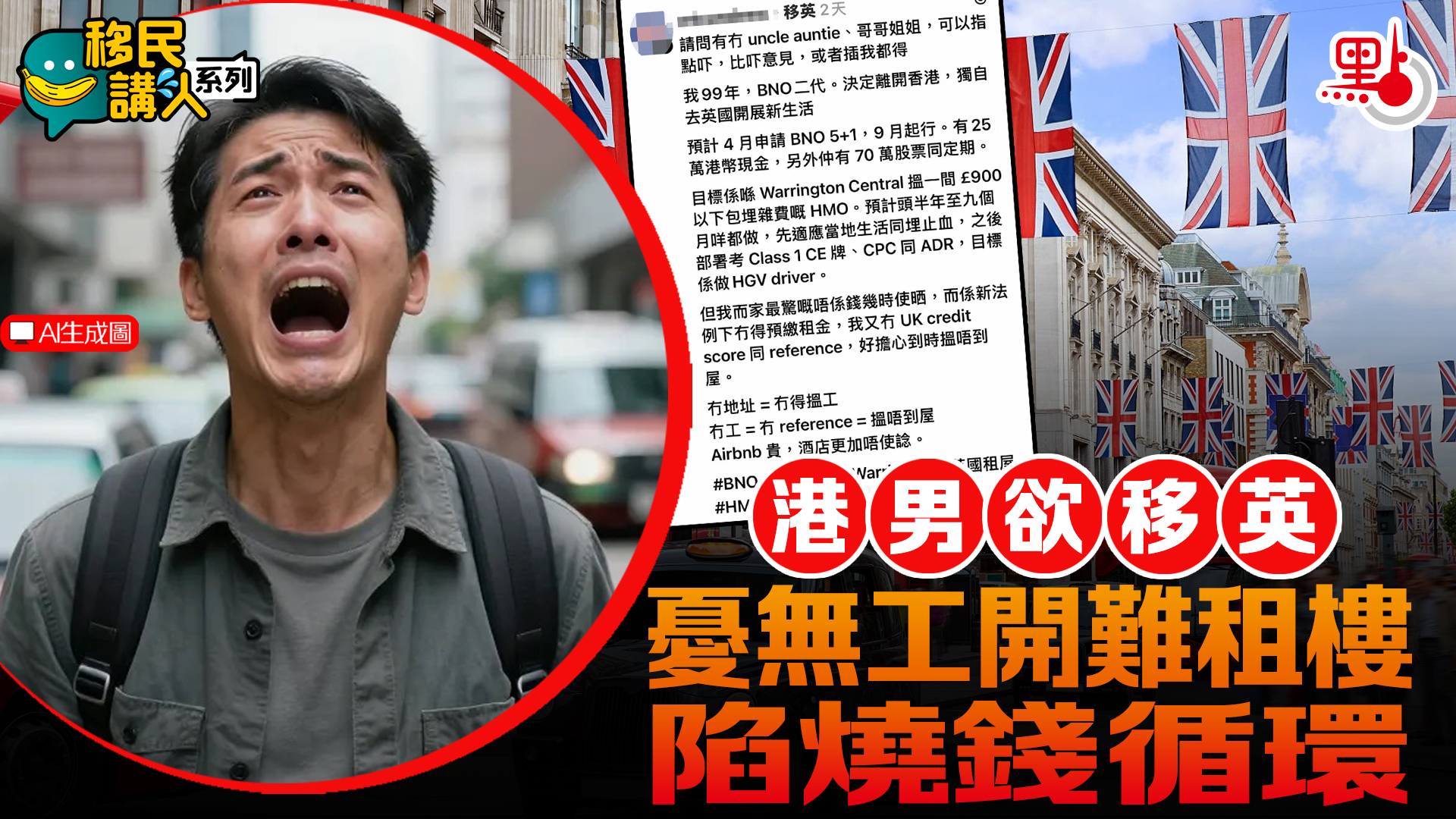 【點新聞報道】移民是一件非常燒錢的事情,有港男在網上發文話,打算獨自去英國開展新生活,希望到埗後先搵工再租樓咁話。不過,由於英國不少工作需要求職者有固定住所才能聘用,令他擔心會陷入租樓搵工的兩難循環。