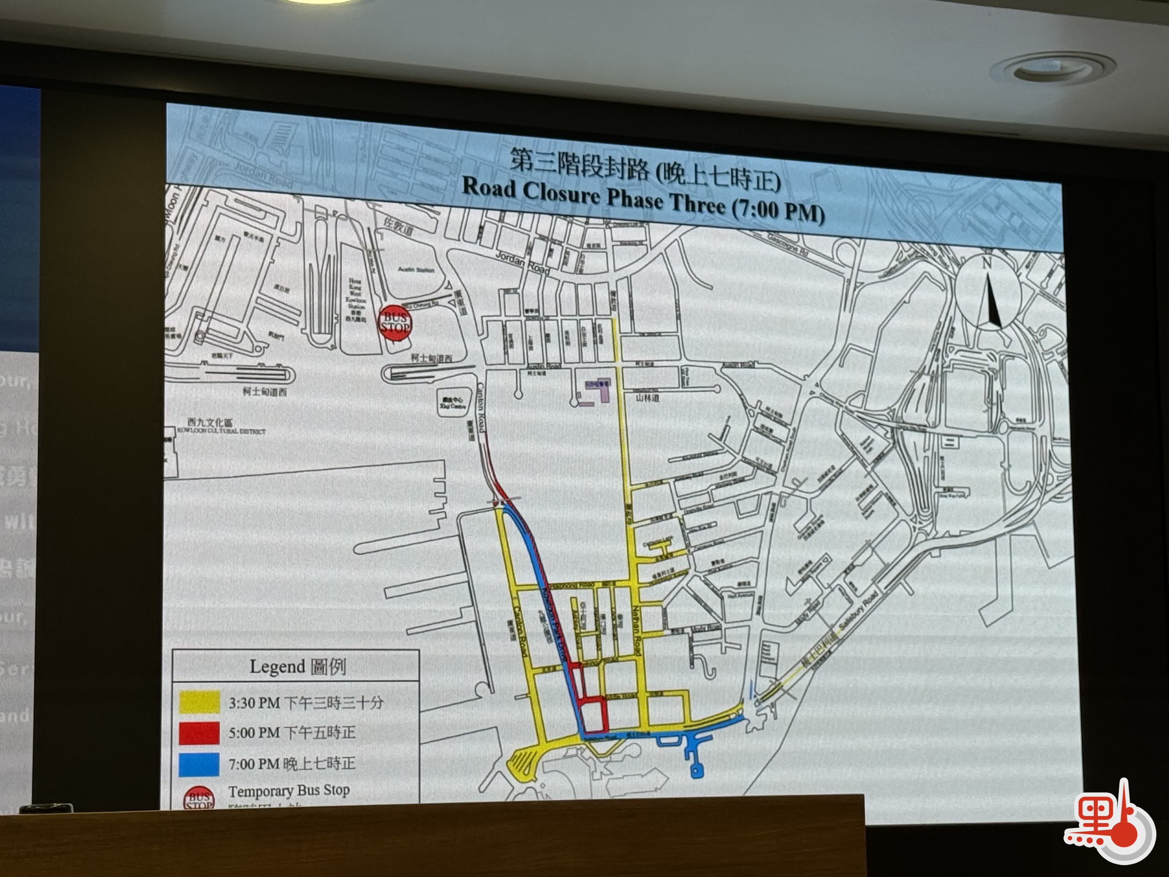 受廣泛封路影響,運輸署預計港島北一帶(包括銅鑼灣、灣仔、金鐘、中區及東區走廊)、九龍尖沙咀及西九文化區一帶,以及海底隧道和香港仔隧道的交通將會顯著擠塞。駕駛人士請避免駕車前往上述受道路封閉影響的地區,如遇交通擠塞,請保持忍讓及小心駕駛,並遵從在場警務人員的指示。