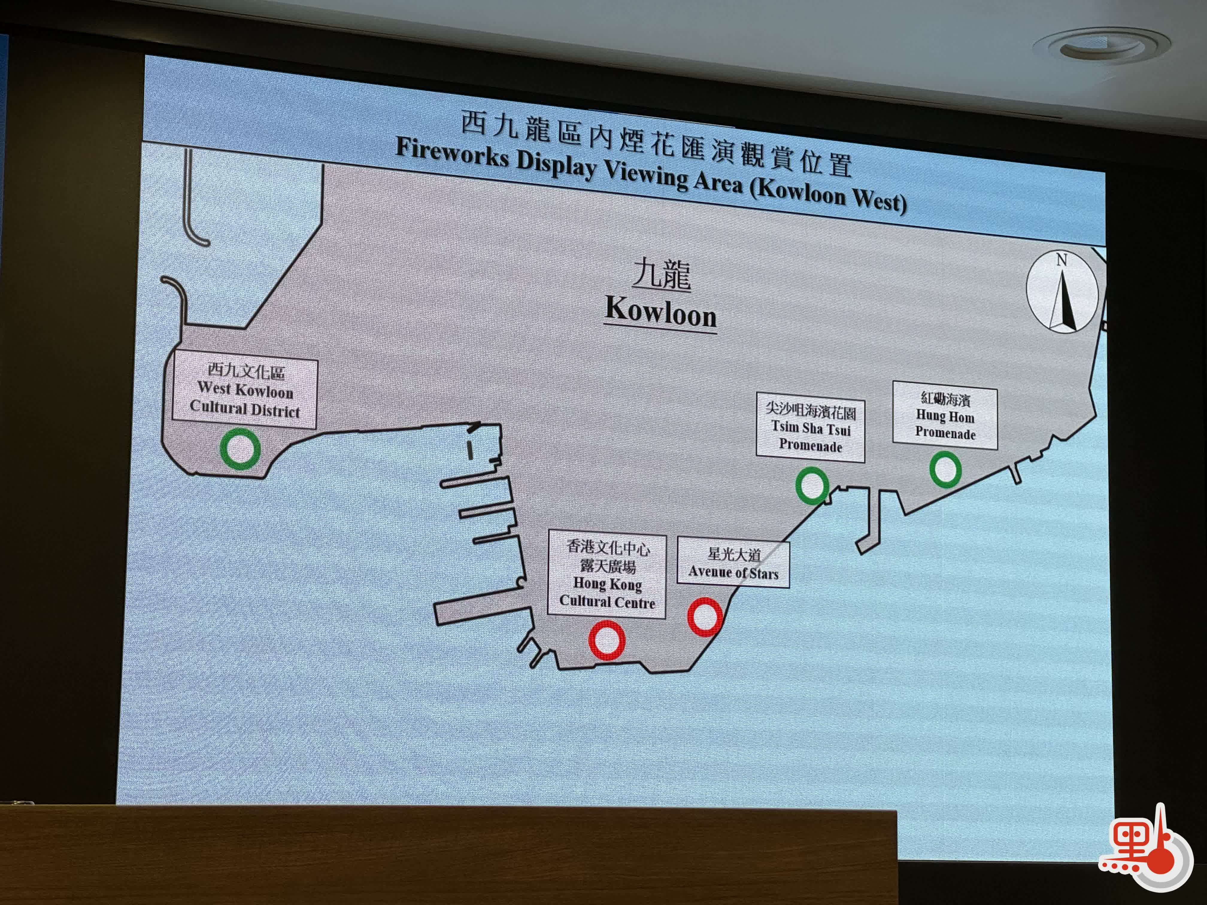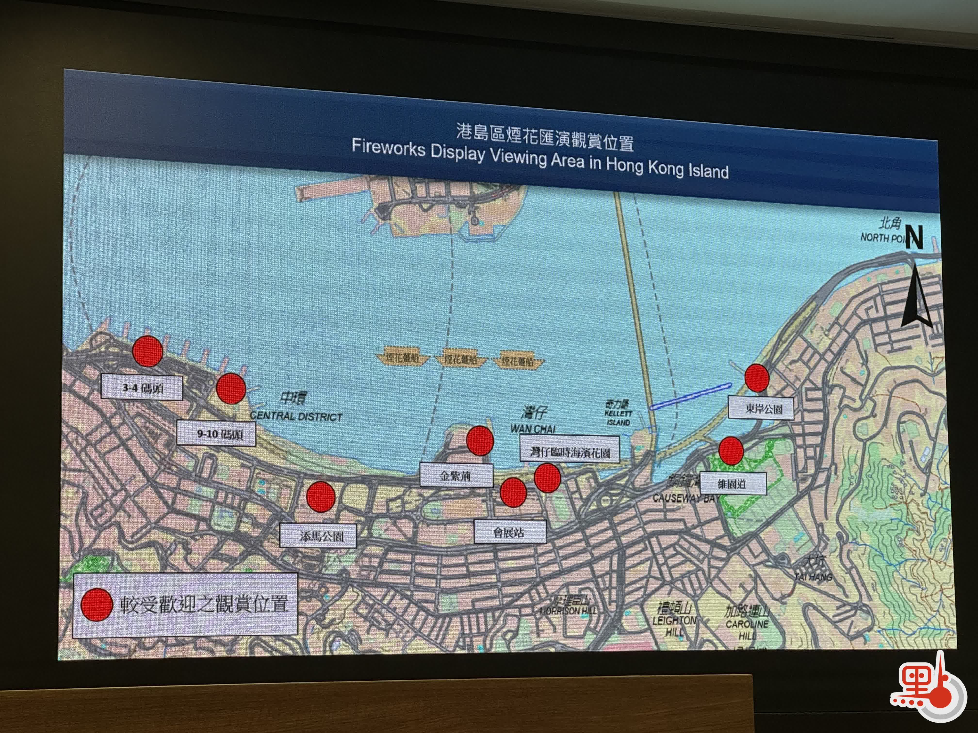 與此同時,海事處當日亦將實施海上交通管制,並加強檢查觀賞船隻,以確保船隻符合安全要求。海事處當日下午2時至晚上約10時30分,在燃放煙花的躉船停泊範圍,即灣仔香港會議展覽中心對開海面設立禁區。而在當日晚上7時至約9時,維多利亞港中部將設立限制區域。除獲特別許可的船隻外,其他船隻不得進入此禁區和限制區域。獲批准定期渡輪則可維持服務至晚上7時40分。