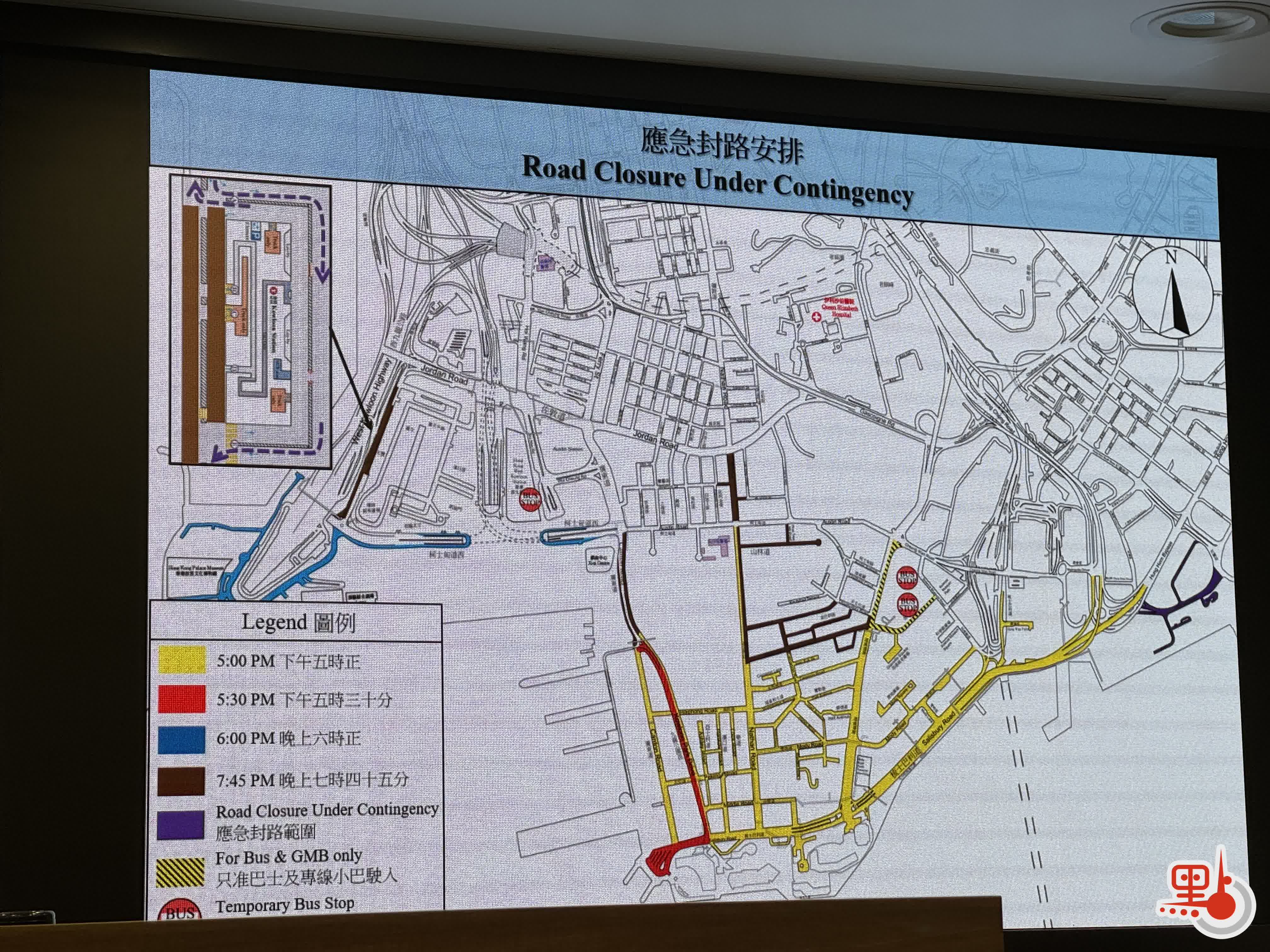 皇崗口岸短途跨境巴士服務方面,將設有臨時站點——灣仔至皇崗口岸的短途跨境巴士服務位於會展站公共運輸交匯處的站點,將由下午約5時起暫停使用至道路重開,臨時總站將設於軒尼詩道(西行)近修頓中心;