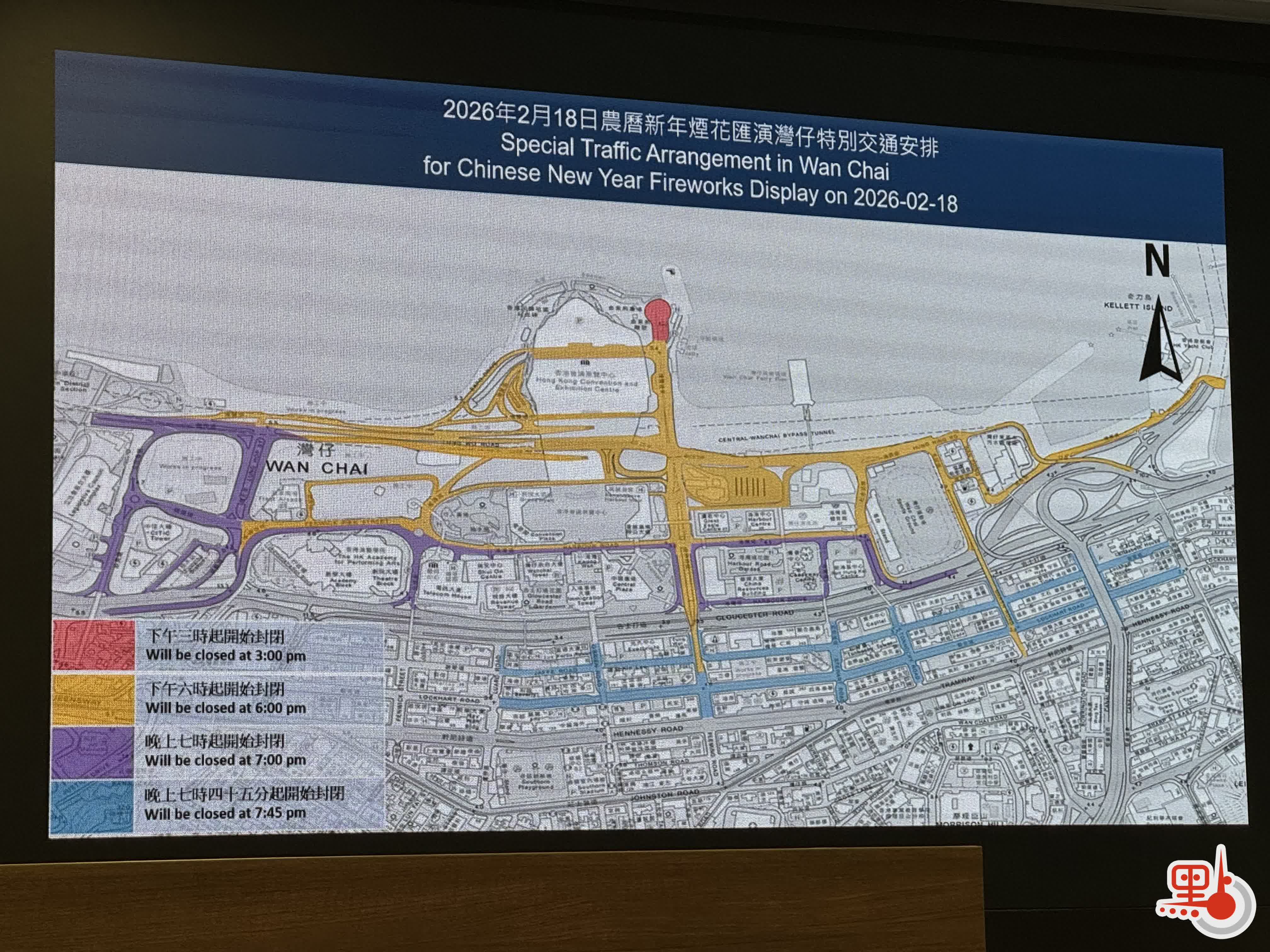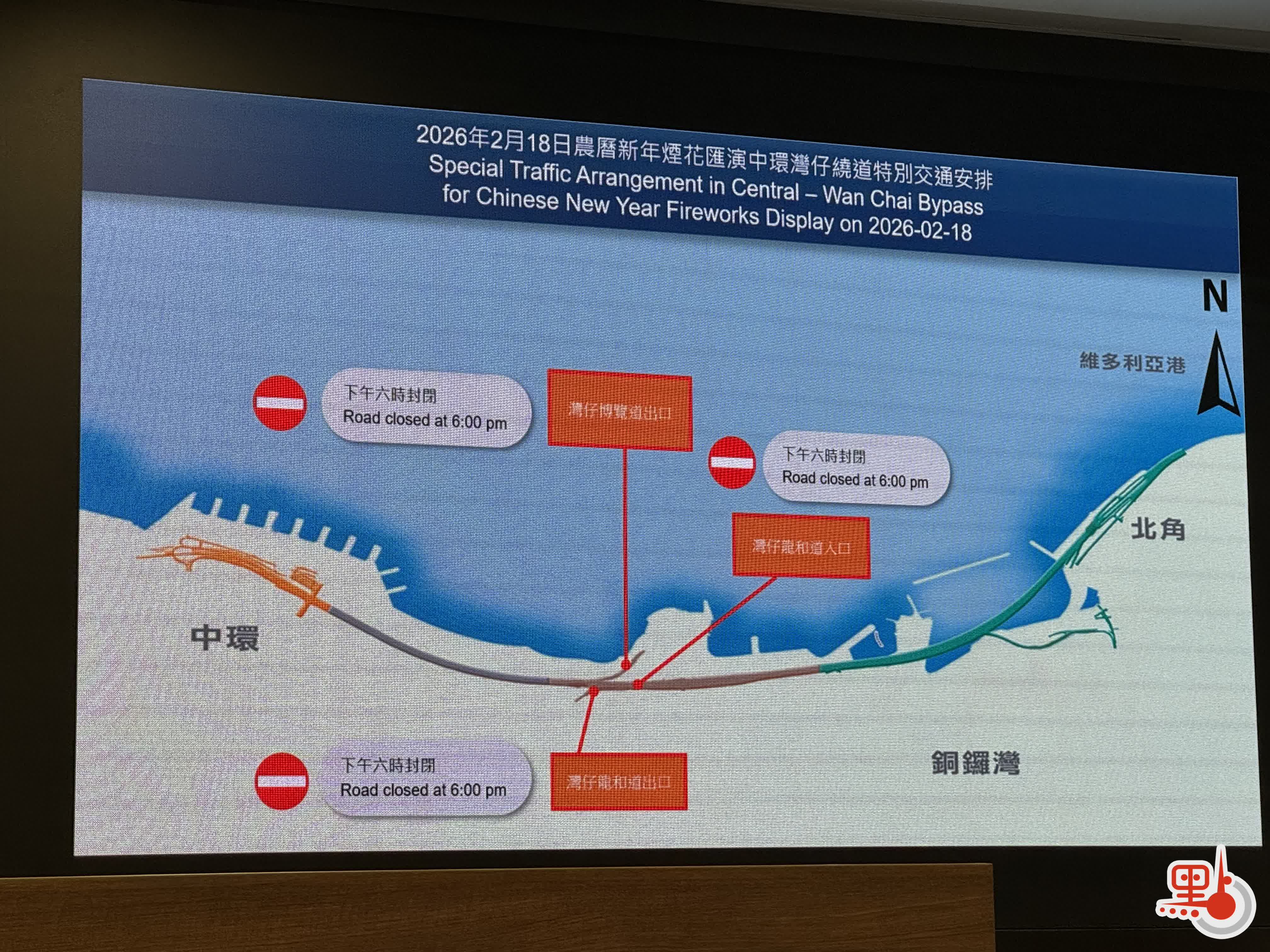農曆新年煙花匯演將於年初二晚上8時在維港舉行,港島中區、灣仔及東區將由當天下午約6時起分階段實施封路措施及相應的改道安排。另外,介乎民康街與維園道之間的一段東區走廊(西行)會由晚上7時45分起臨時封閉,禁止車輛(專營巴士除外)駛入,直至道路重開。