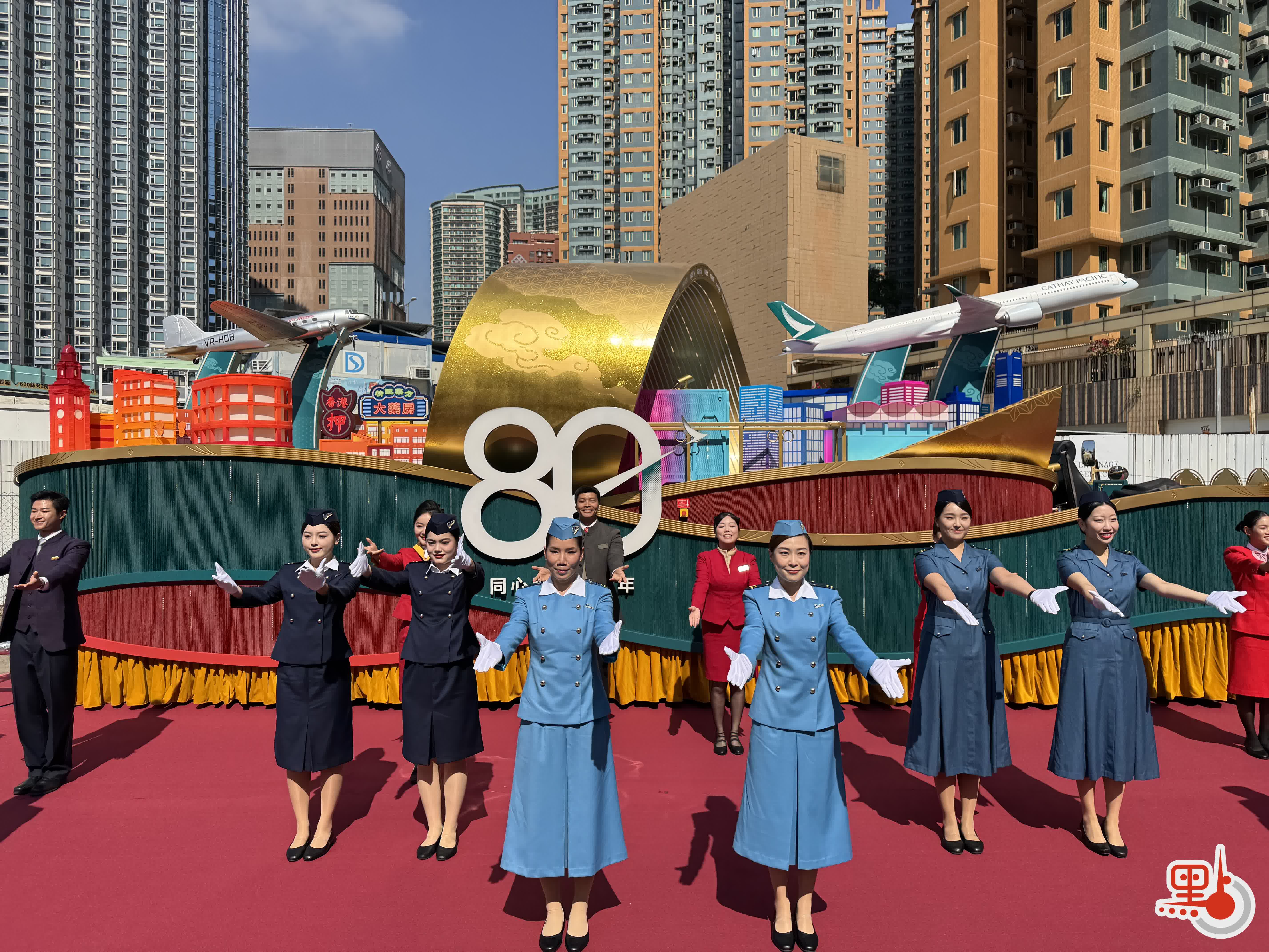 12輛花車齊聚亮相,其中有不少「老朋友」。連續冠名贊助24年的國泰今年迎來80周年,其花車展示了兩款經典客機「Betsy」DC-3及「空中巴士A350」,80位國泰員工穿上不同年代的經典懷舊制服帶來精彩的舞蹈演出。