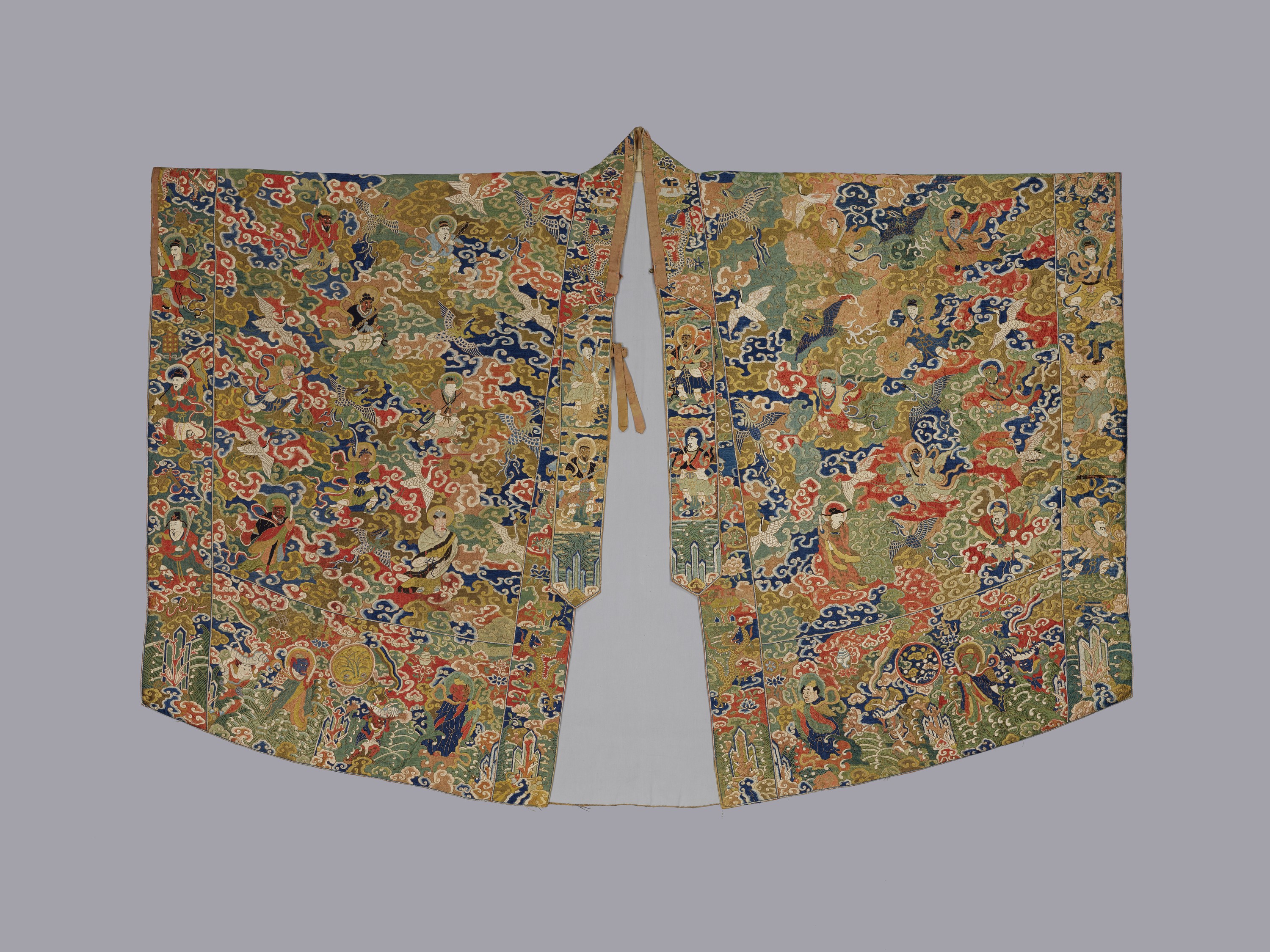 繡滿近百名道教神祇,背面呈現天官、地官、水官出巡的盛景。絳衣可能在「三官誕辰」,即上元節、中元節、下元節時在道觀中用於道場儀式,寓意天官賜福、消災解厄。