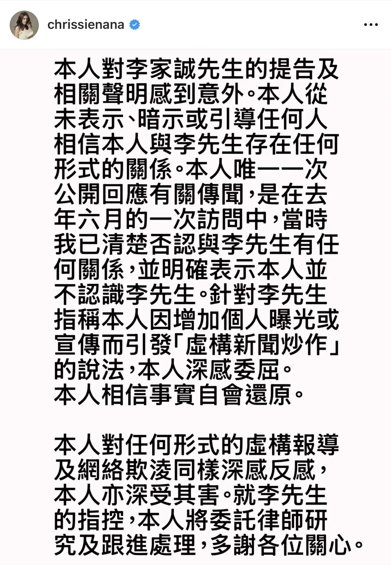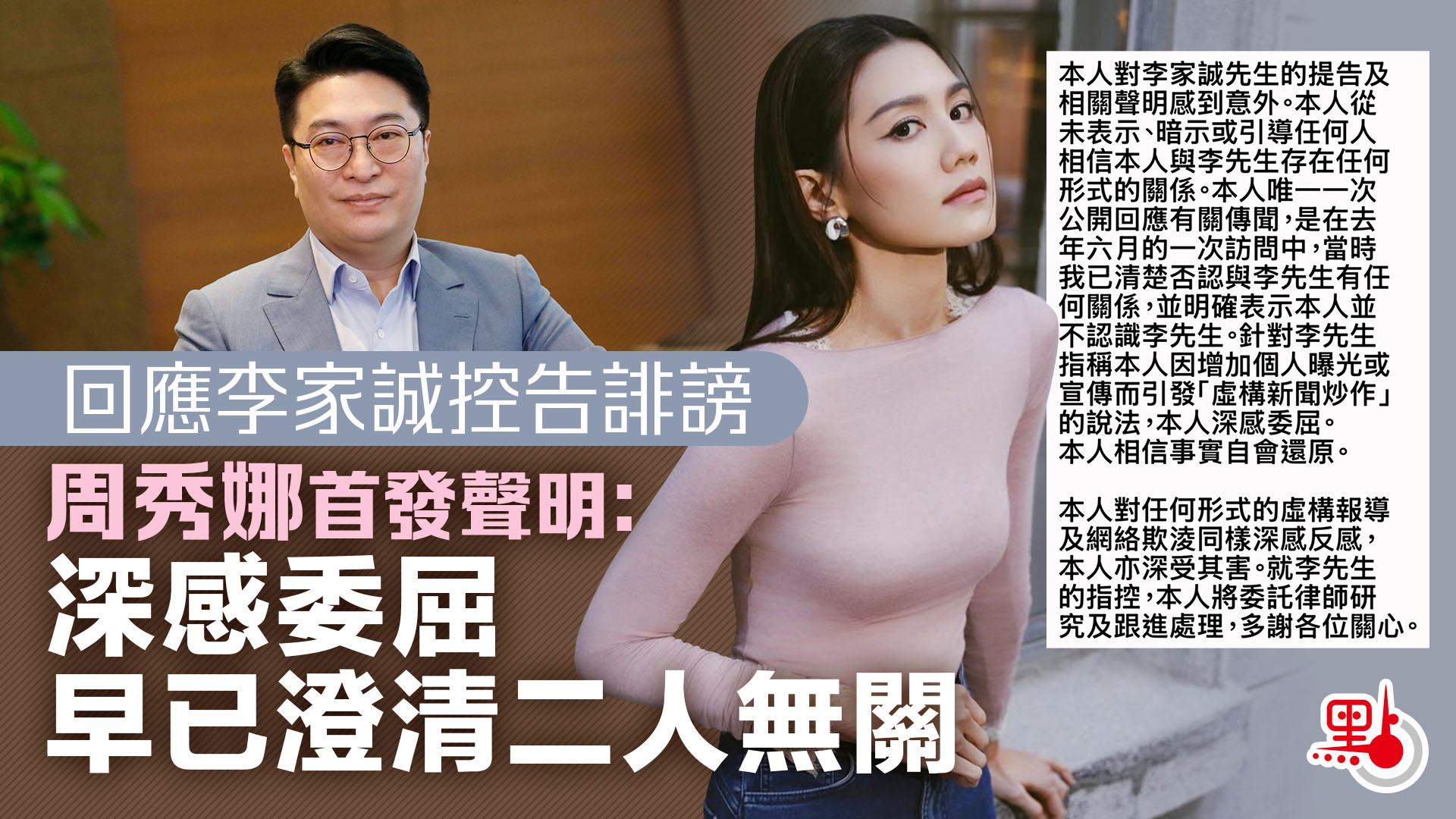 回應李家誠控告誹謗 周秀娜首發聲明:深感委屈 早已澄清二人無關