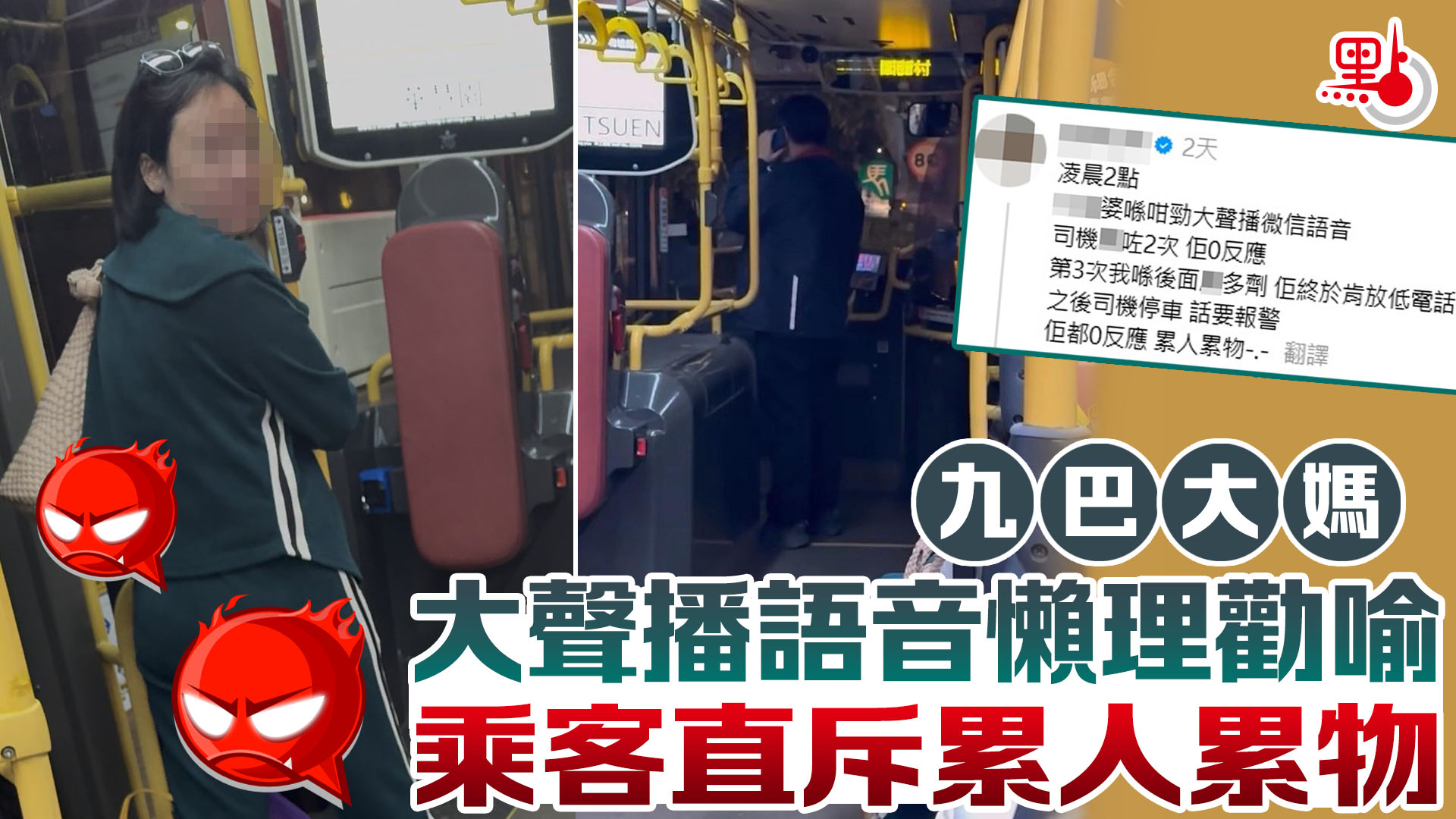 有網民在社交平台threads發文,指日前乘搭巴士時,遇到一名大媽乘客大聲播微信語音,還懶理車長多次勸喻,最終司機決定停車報警,「凌晨2點,XX婆喺咁勁大聲播微信語音,司機X咗2次,佢0反應,第3次我喺後面X多劑,佢終於肯放低電話,之後司機停車,話要報警,佢都0反應,累人累物」。