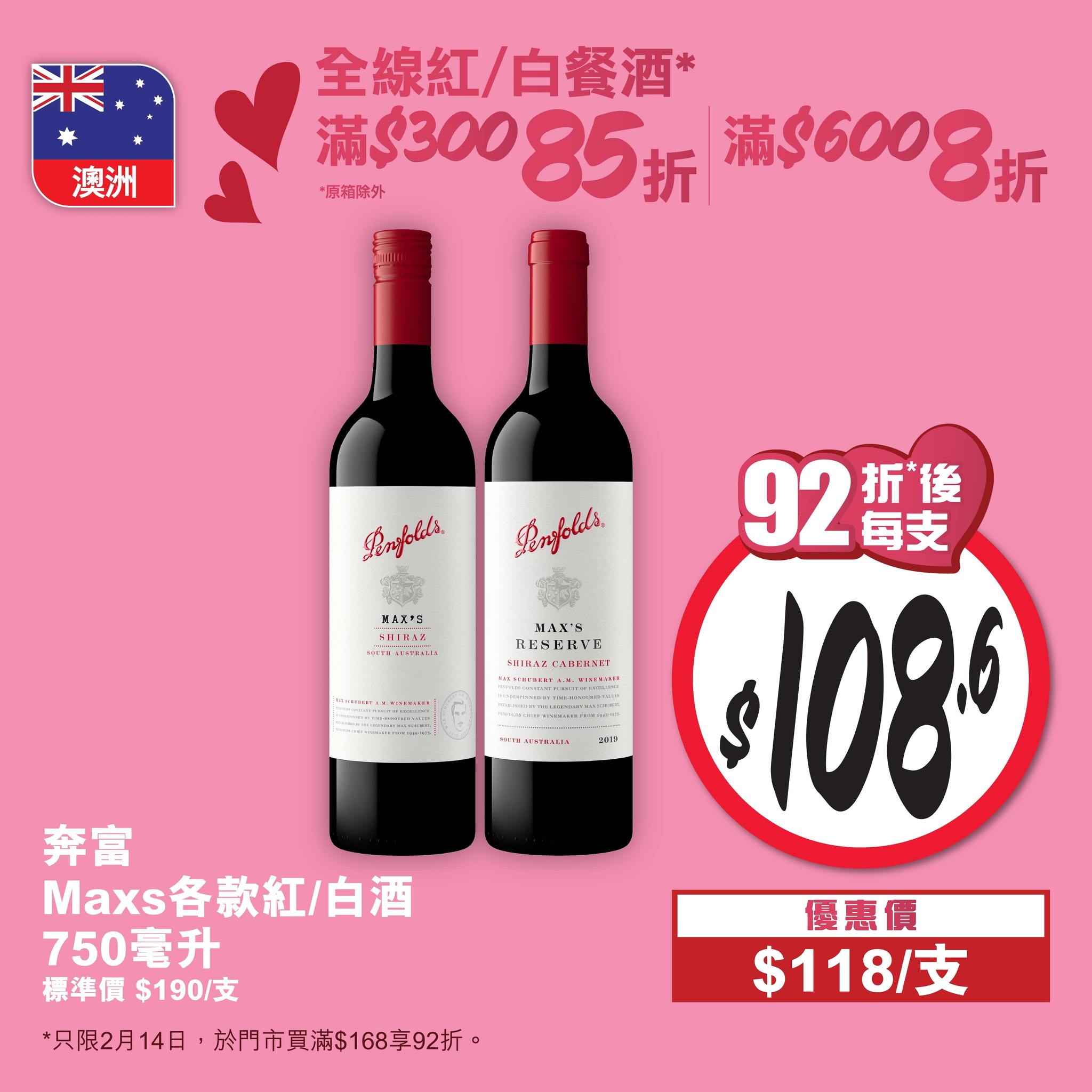 【點新聞報道】惠康全線門市2月14日情人節當天推出一日限定折扣,買滿$168即享92折,購買任何紅/白餐酒滿$300即同時再享85折。