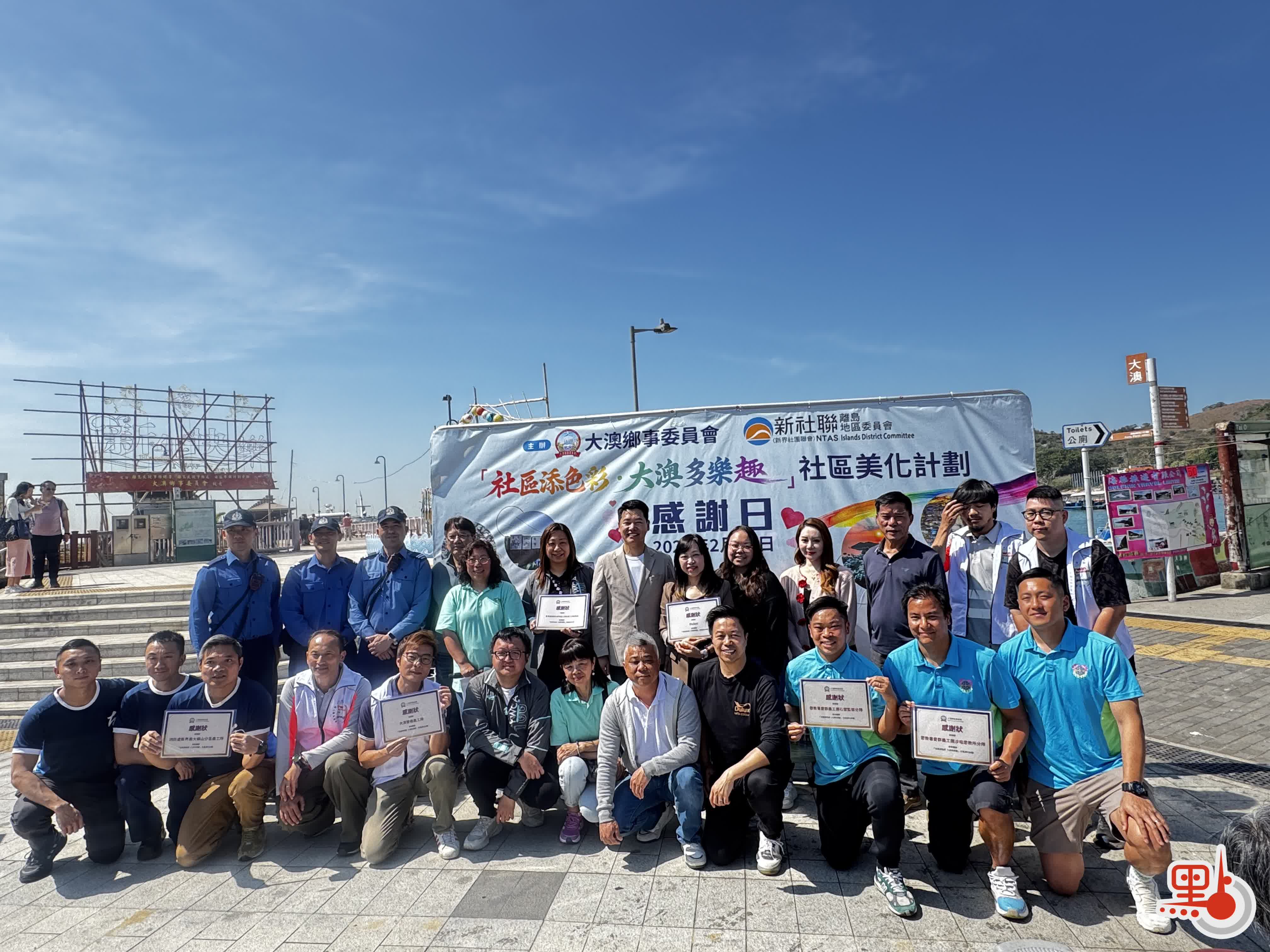 【點新聞報道】一排五彩繽紛的水上棚屋倒映在水道之中,為素有「東方威尼斯」之稱的大澳漁村,添上一抹活力色彩。首階段的美化計劃,共為五間鐵皮棚屋換上藍、紫、黃、綠等新裝。有別於一般油漆,這次採用的具備防水與隔熱功能,既美觀又實用。今日(14日)的感謝儀式上,一眾參與機構包括贊助商Dulux、香港紅十字會、消防處、懲教署、大澳義工隊等的義工聚首一堂,接受由大澳鄉事委員會主席何紹基、新社聯離島地區委員會主席祝慶台頒發的感謝狀。