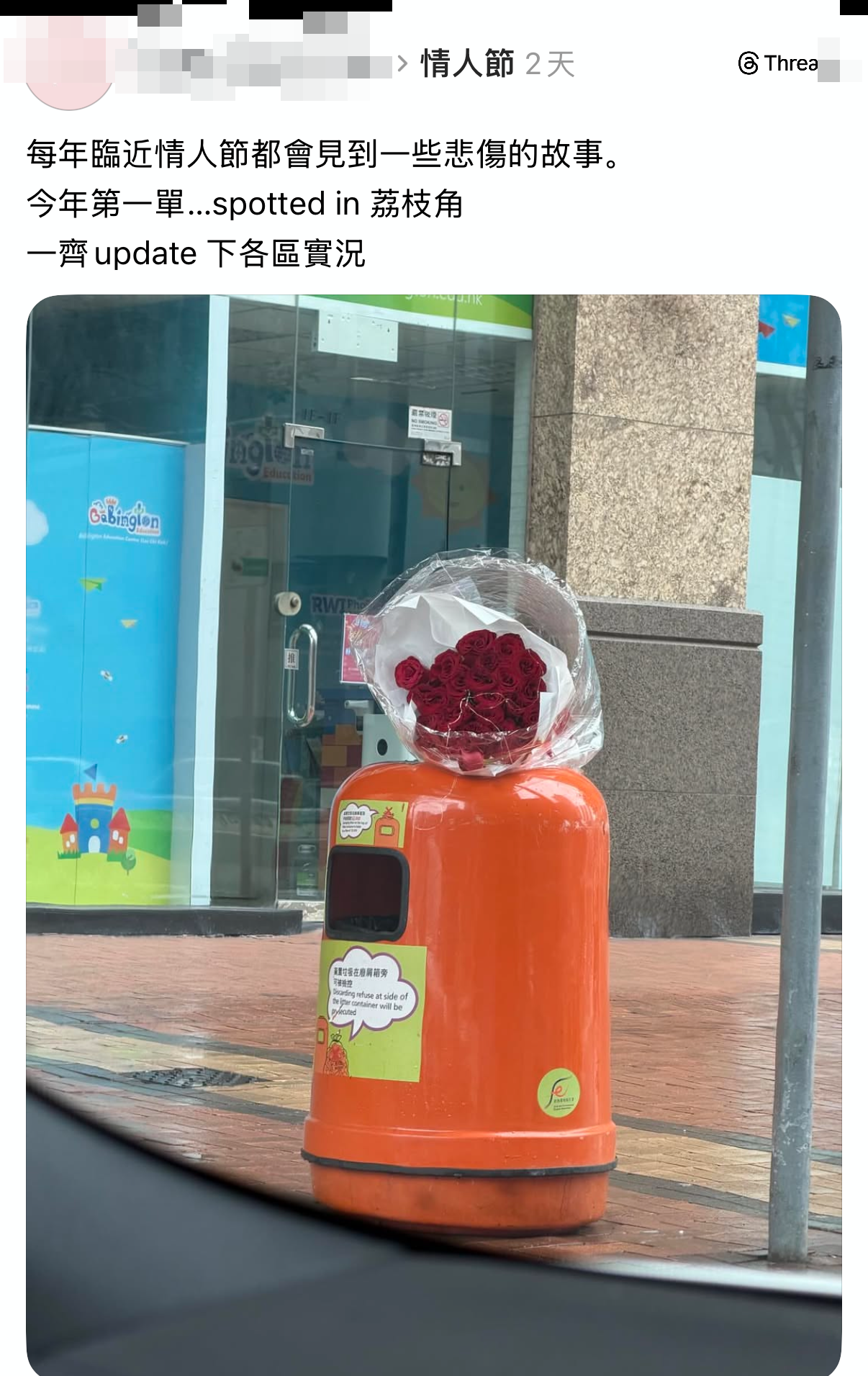 樓主日前以「情人節」為題上載相片發帖,留言指「每年臨近情人節都會見到一些悲傷的故事。今年第一單…spotted in(地點位於)荔枝角。一齊update(更新)下各區實況」。相中可見,一大束紅玫瑰被棄置於垃圾桶頂,膠袋包裹着花束,其中一枝花更散落在外,畫面格外孤清。