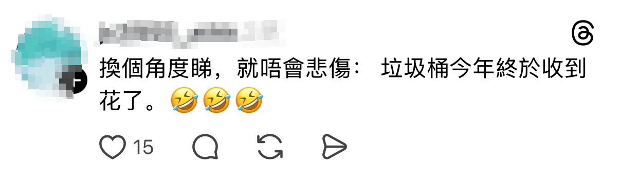 被棄置的愛情不但令人唏噓,更惹來一群疑似單身的網民顧影自憐,留言感慨「垃圾桶都有花收」、「個垃圾桶都有拍拖咩」、「連垃圾桶都有花收,我呢」、「換個角度睇,就唔會悲傷:垃圾桶今年終於收到花了。」