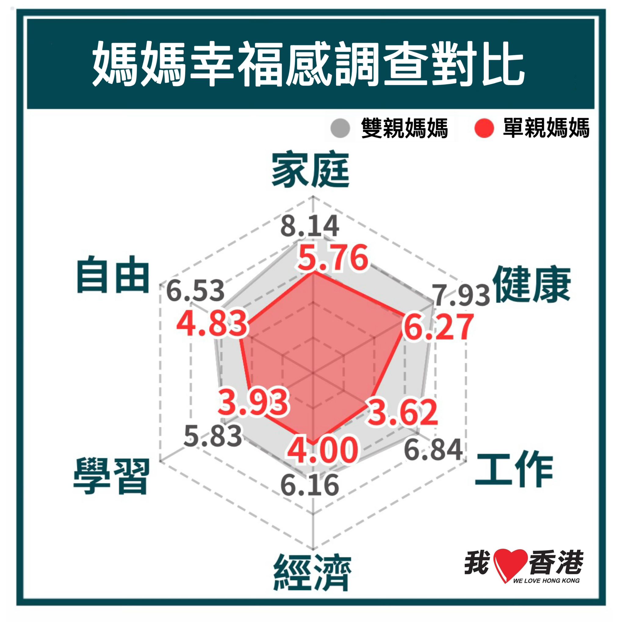 協會同時開展一項問卷調查,邀請500多位雙親家庭及單親家庭的媽媽分別就6個項目的幸滿感評分,包括家庭生活﹑健康狀況﹑事業發展﹑經濟狀況﹑進修機會及個人自由及生活平衡。結果發現,以10分為滿分,雙親家庭的媽媽對所有項目的幸福感評分都合格,平均有6.9分,以家庭生活為最高分;而單親家庭的媽媽的整體評分不合格,只有4.73分,當中對健康的評分則最高,惟對事業發展﹑經濟狀況﹑進修機會及個人自由及生活平衡的幸福感評分都不合格。另外,單親家庭的媽媽對所有項目的幸福感評分均低於雙親家庭的媽媽,當中事業發展﹑家庭生活及經濟狀況的差距尤大。