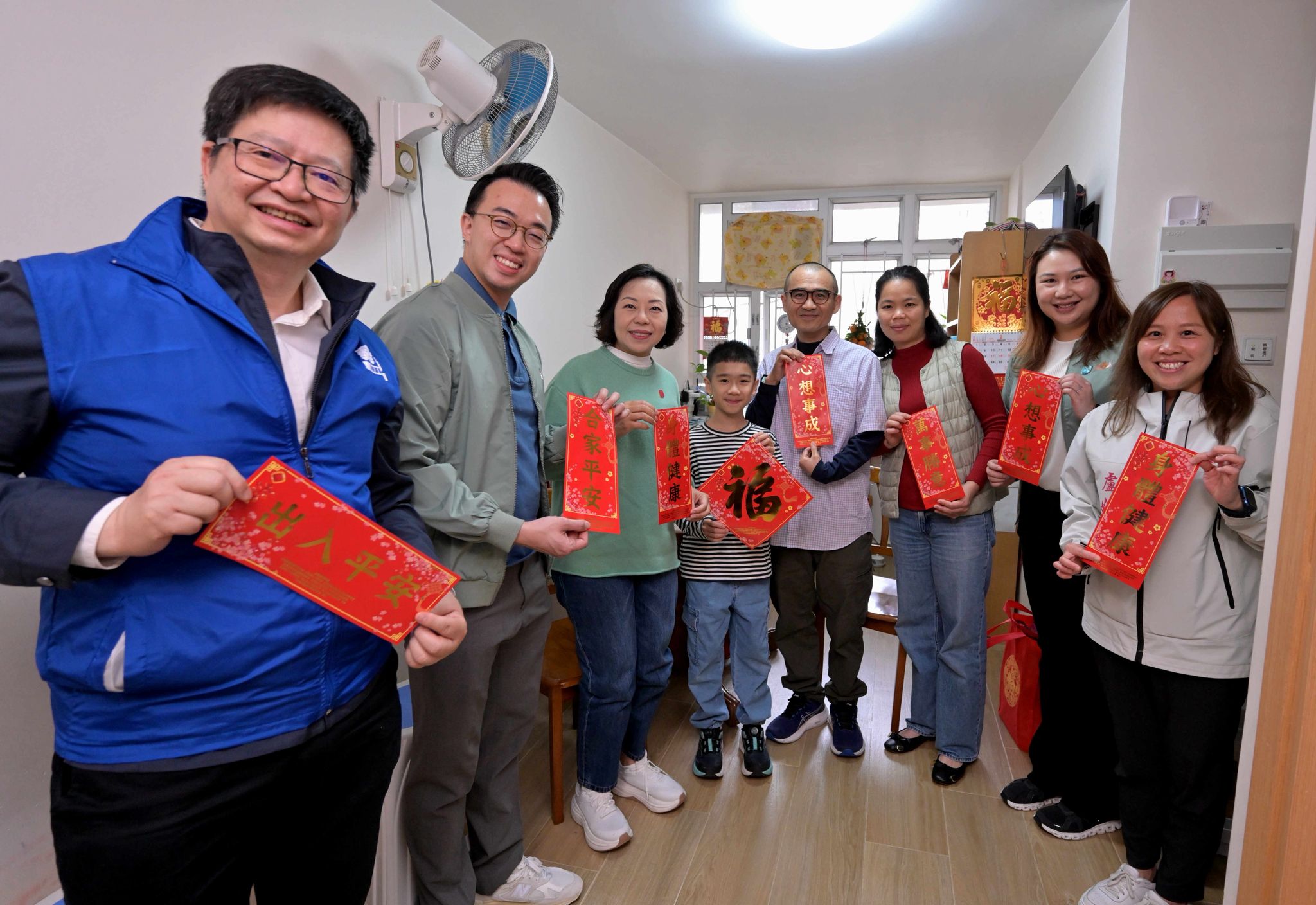 民政及青年事務局局長麥美娟在葵青民政事務專員梁乘龍陪同下,聯同葵青區區議員和關愛隊代表探訪居於長安邨的中產家庭和雙老家庭,聆聽他們的生活點滴,並送上節日祝福。