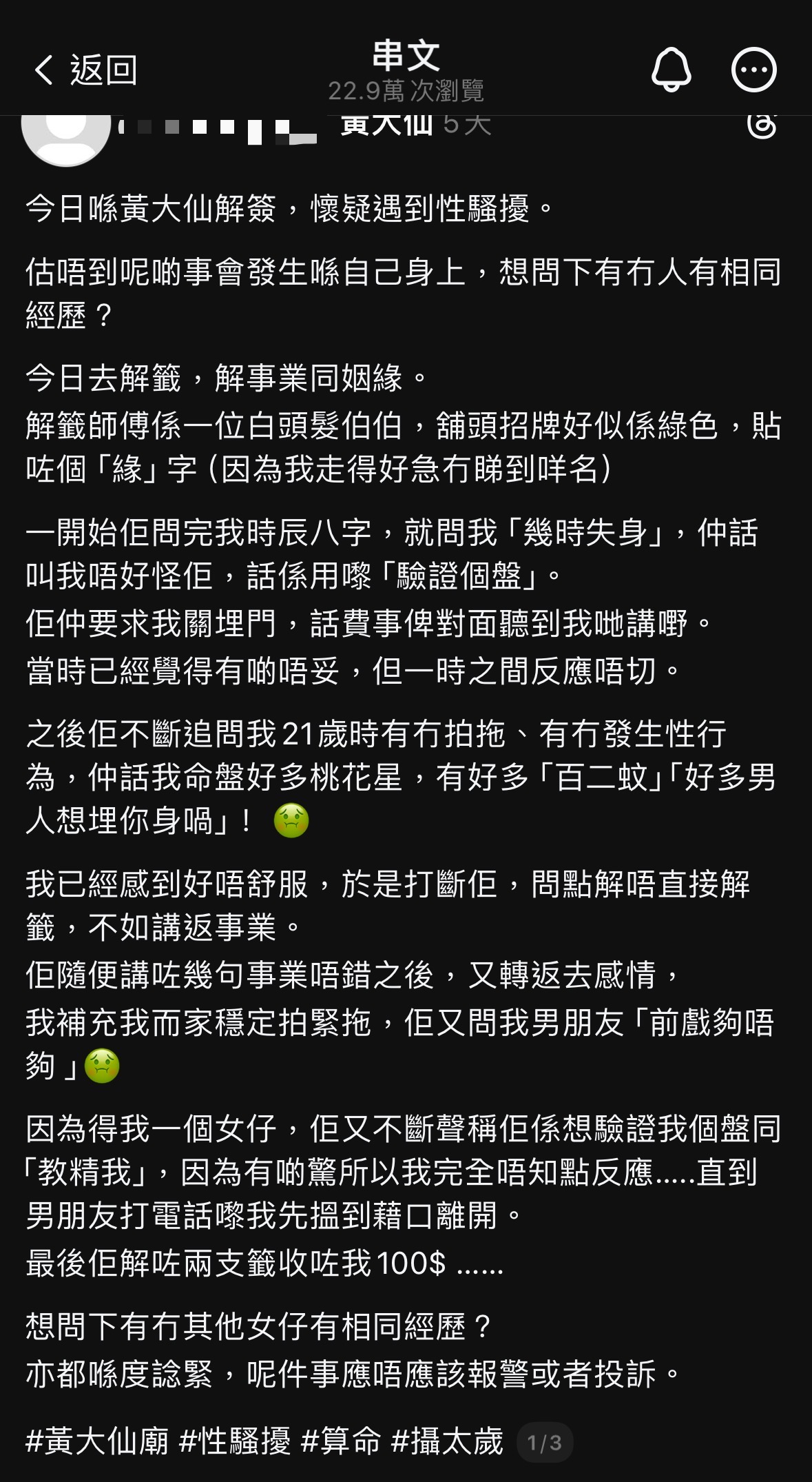 該網民在社交平台發文,指自己到黃大仙祠解籤,求解事業及姻緣,而解籤師傅是一位「白頭髮伯伯」。對方詢問其時辰八字後,隨即問「幾時失身」,聲稱問題用於驗證命盤。解籤人又要求她關門,再追問女事主21歲時有否拍拖及發生性行為。得知對方正在拍拖,竟追問「男朋友『前戲』做得夠唔夠」。女事主表示當時獨自在場,感到害怕,直到男朋友致電才找藉口離開,解籤師傅則向她收取解籤費100元。