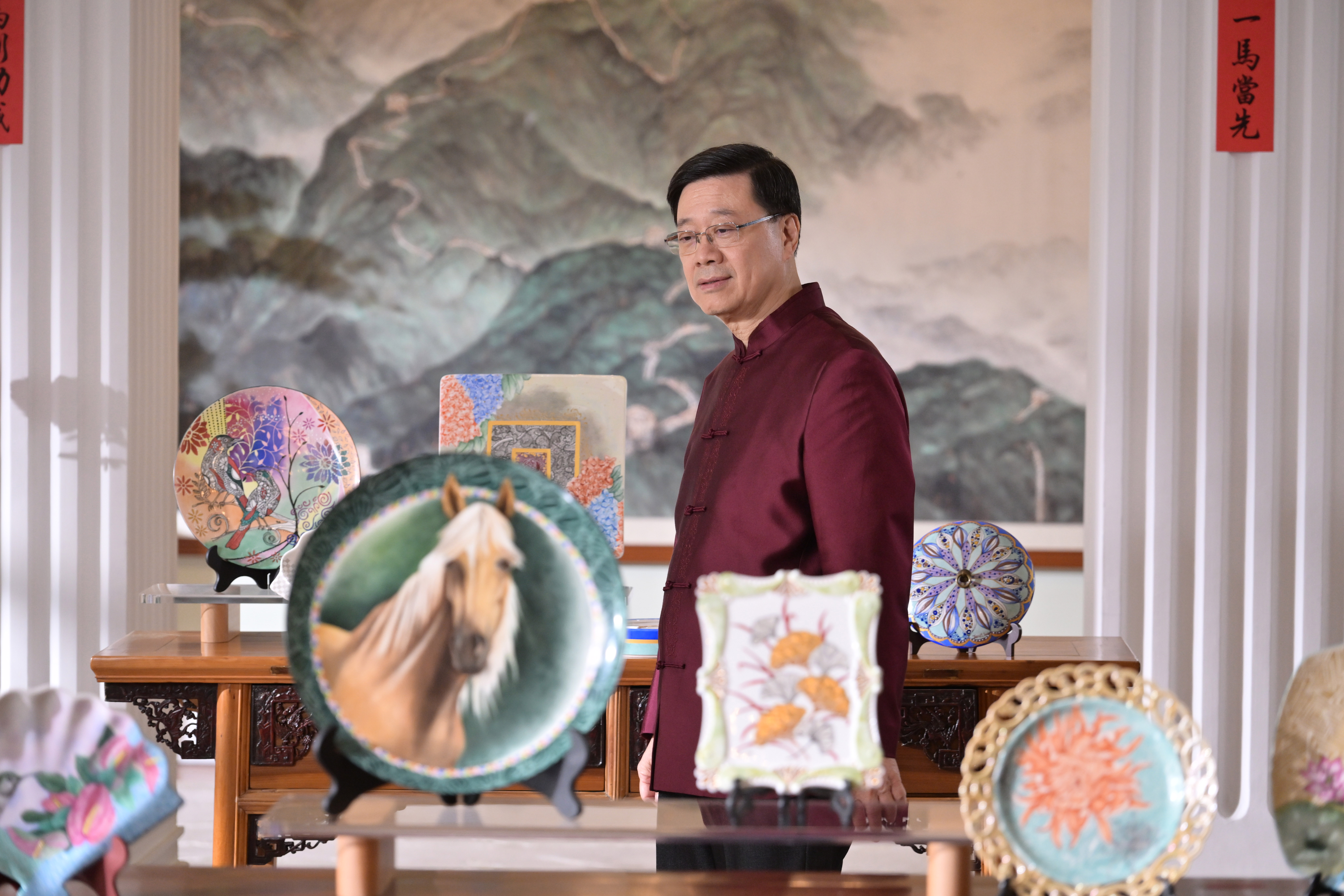 李家超與太太林麗嬋齊齊換上喜慶的紅色唐裝,拍片向市民拜年。太太更在片中一展畫技,在瓷碟上畫出奔馳駿馬,十分傳神。