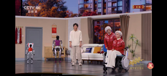 有網友指「2026馬年春晚被機器人全面『入侵』」,機器人除在歌曲節目中亮相外,更成為小品節目中的趣味元素。時隔30年,資深藝人蔡明與機器人再續前緣,在節目《奶奶的最愛》中,再度出演「奶奶機器人」,與1996年她在春晚出演的機器人「菜花」形成呼應,有網友更在網上調侃說:「蔡明完成了從機器人女友到機器人奶奶的轉型」。