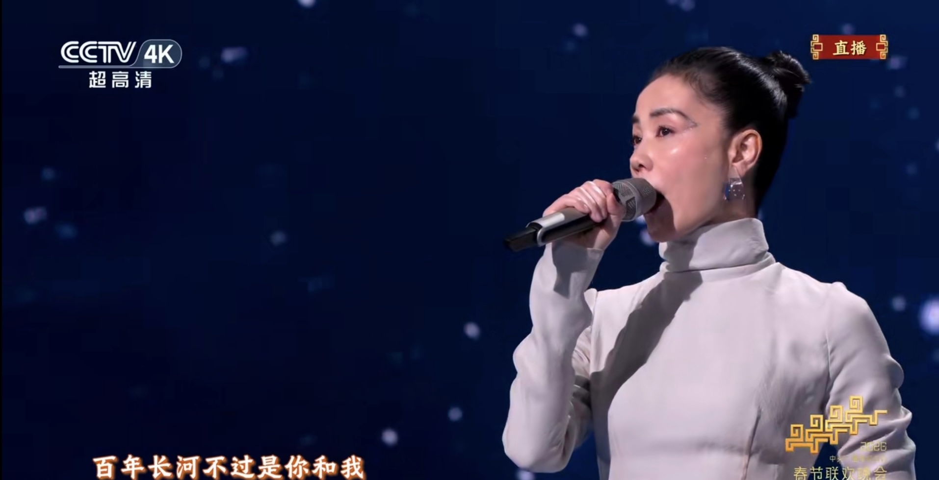 王菲着一席白裙登場,耳戴水滴狀耳墜,以空靈嗓音帶來動人歌聲,用「百年長河不過是你和我經歷的一刻」讓觀眾回顧2025年,迎接新歲。