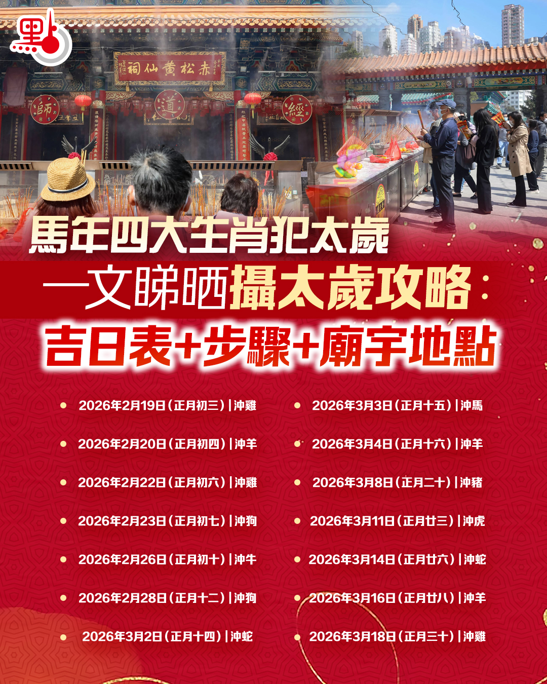 點新聞為大家精心整理2026年丙午馬年犯太歲生肖一覽、適合佩戴的開運飾物、攝太歲最佳吉日,以及相關注意事項,同時列出港九新界熱門拜太歲地點,方便讀者及早準備,趨吉避凶,開啟順風順水的一年!