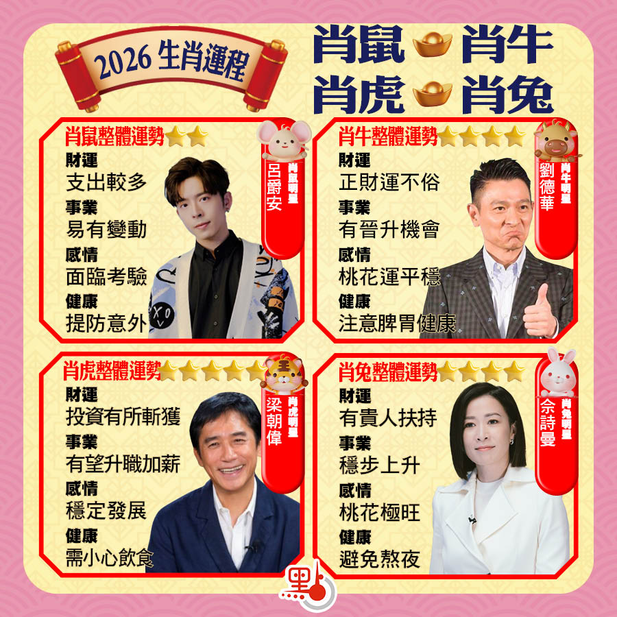 【點新聞報道】今日是馬年大年初一!一元復始,萬象更新,點仔恭祝一眾讀者春節快樂,馬年大吉大利!!每逢農曆新年,不少人都好八卦想知道自己生肖在新的一年會怎樣?點仔已準備好12生肖運程,助大家趨吉避凶,迎接好運勢。今日先嚟睇吓屬「鼠」、「牛」、「虎」及「兔」的朋友啦~