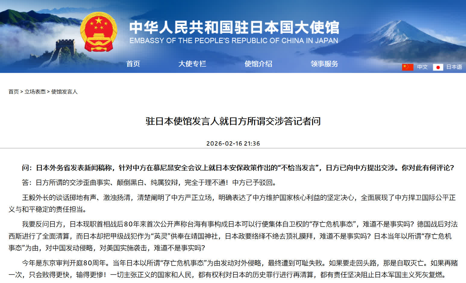 中國駐日本使館發言人表示,日方所謂的交涉歪曲事實、顛倒黑白、純屬狡辯,完全於理不通!中方已予駁回。