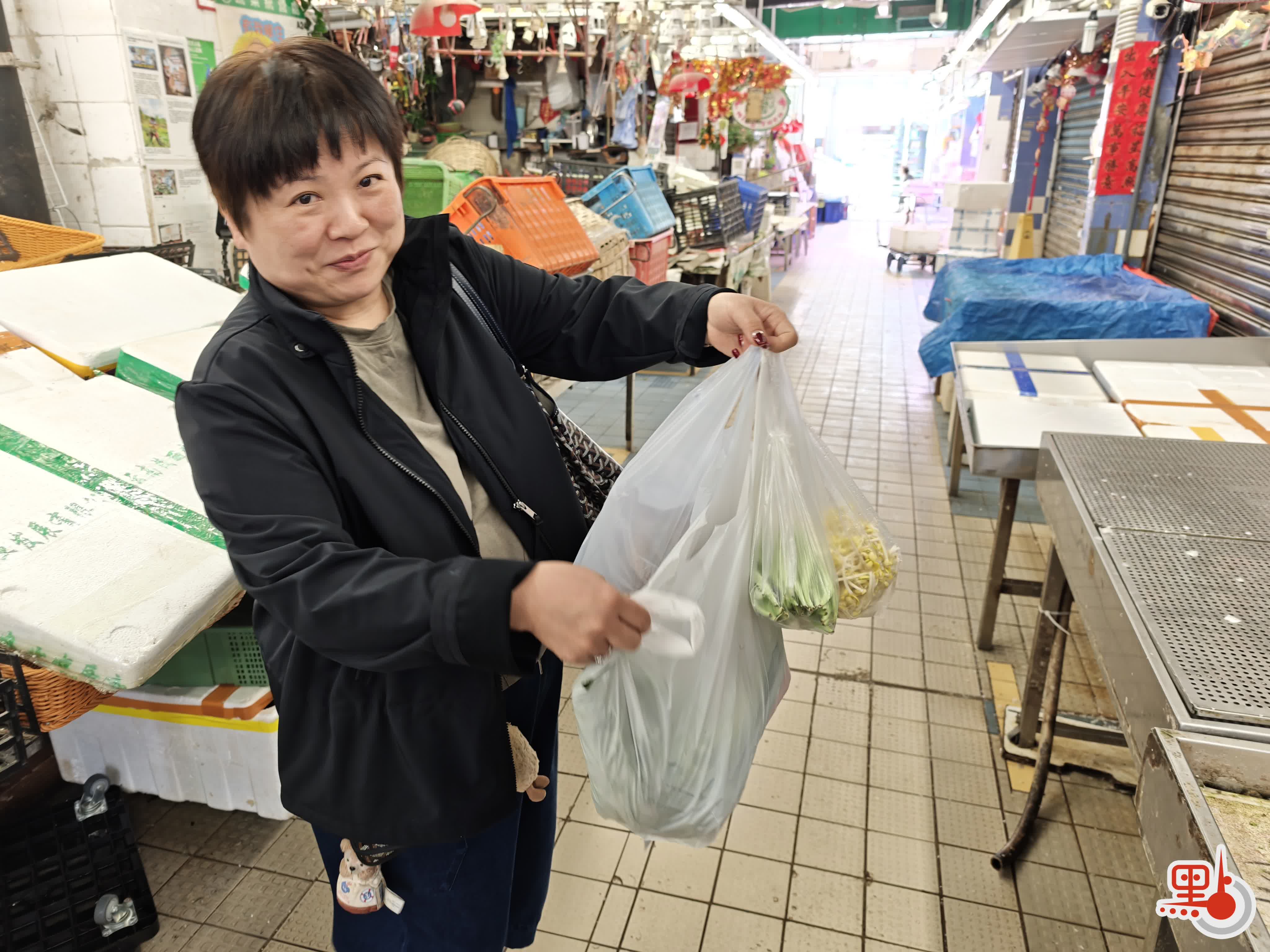 市民劉小姐剛買完菜準備回家,今日在市場共消費約300元,買了一袋蝦和幾包青菜。她說家中亦備有不少食材,準備回去煮上海面與家人共食。雖然假期不少港人外遊,但她選擇留港過年,指此更有節日氣氛,「和朋友、家人一起過年,大家能拜年,小朋友也能拿紅包,和去旅行不一樣」。