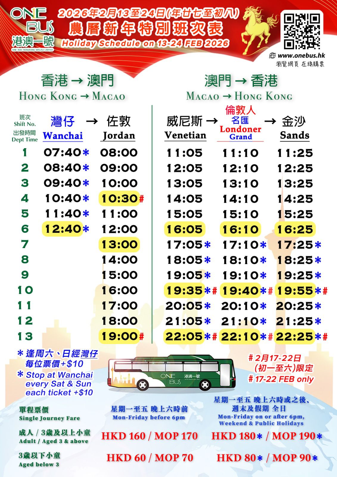「港澳一號」預計年初三及年初四將會是香港前往澳門旅遊的高峰日子,回程將會是初五(21日),預計港澳兩個口岸再接駁前往市區的交通服務需求相當殷切,因此,「港澳一號」向當局申請在新春高峰期,每日增加六個班次往來香港與澳門之間,為旅客提供直達市區及無需等候的港澳直通巴士服務。