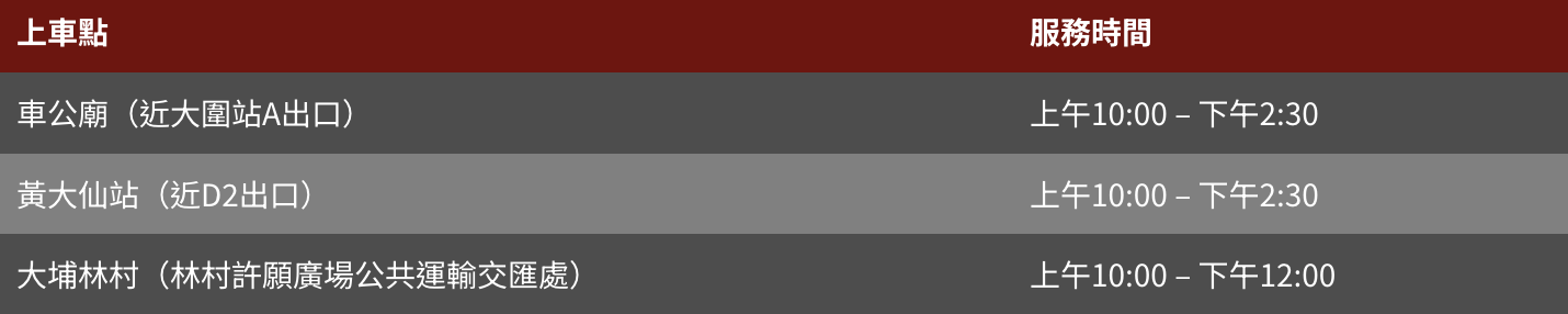 免費接駁巴士服務時間:上午10:00-下午12:30 (每15-20分鐘一班)
