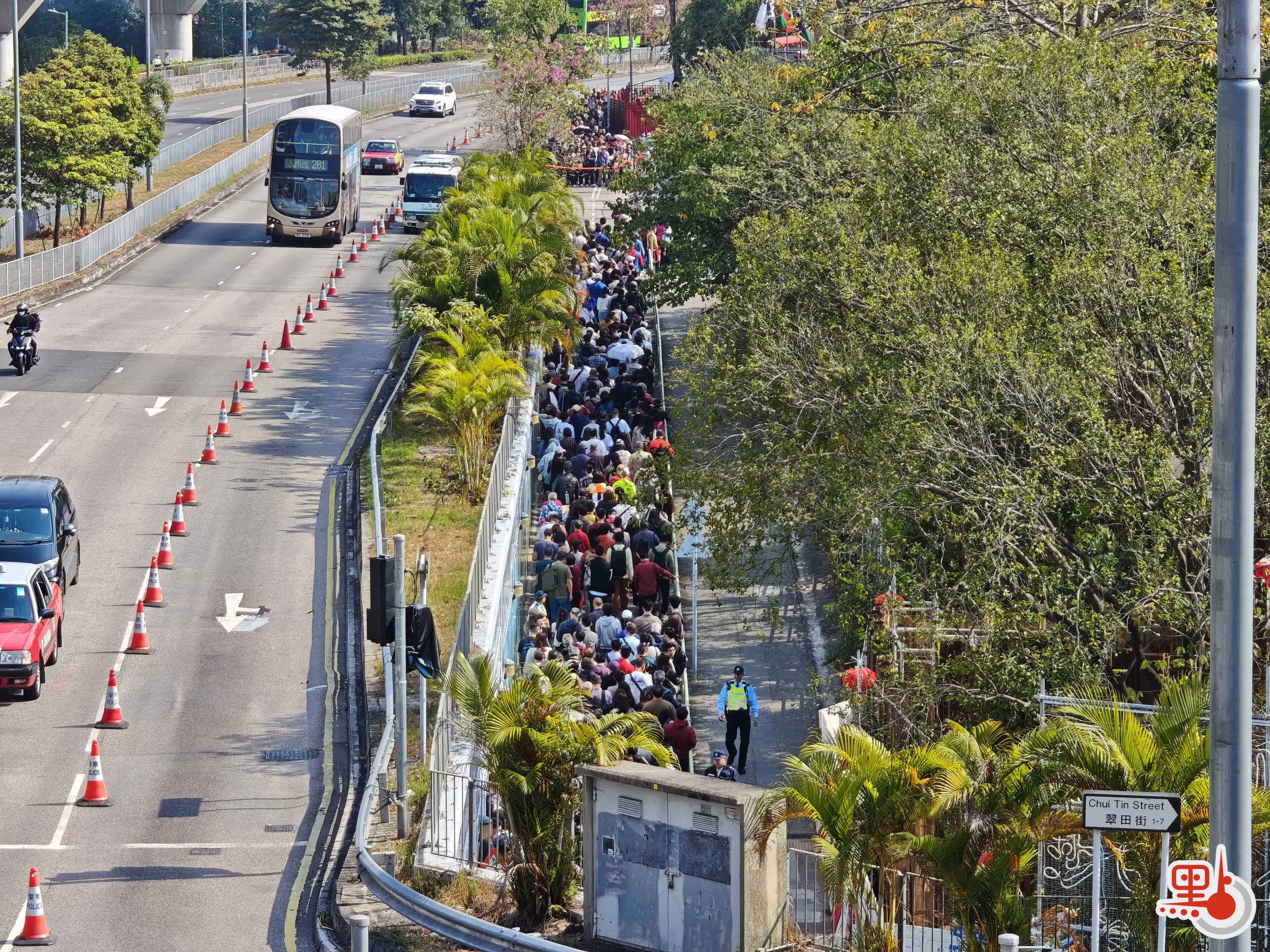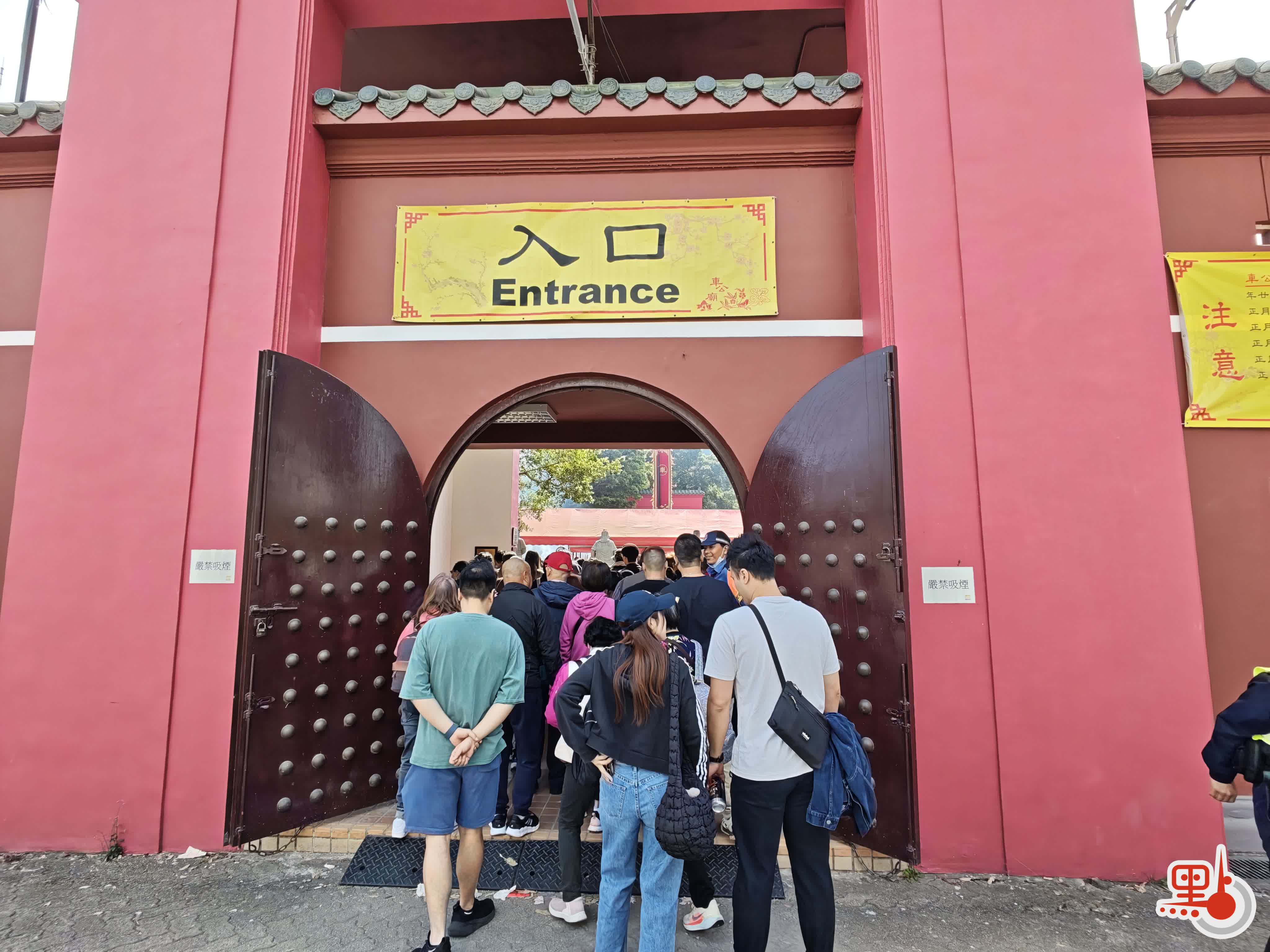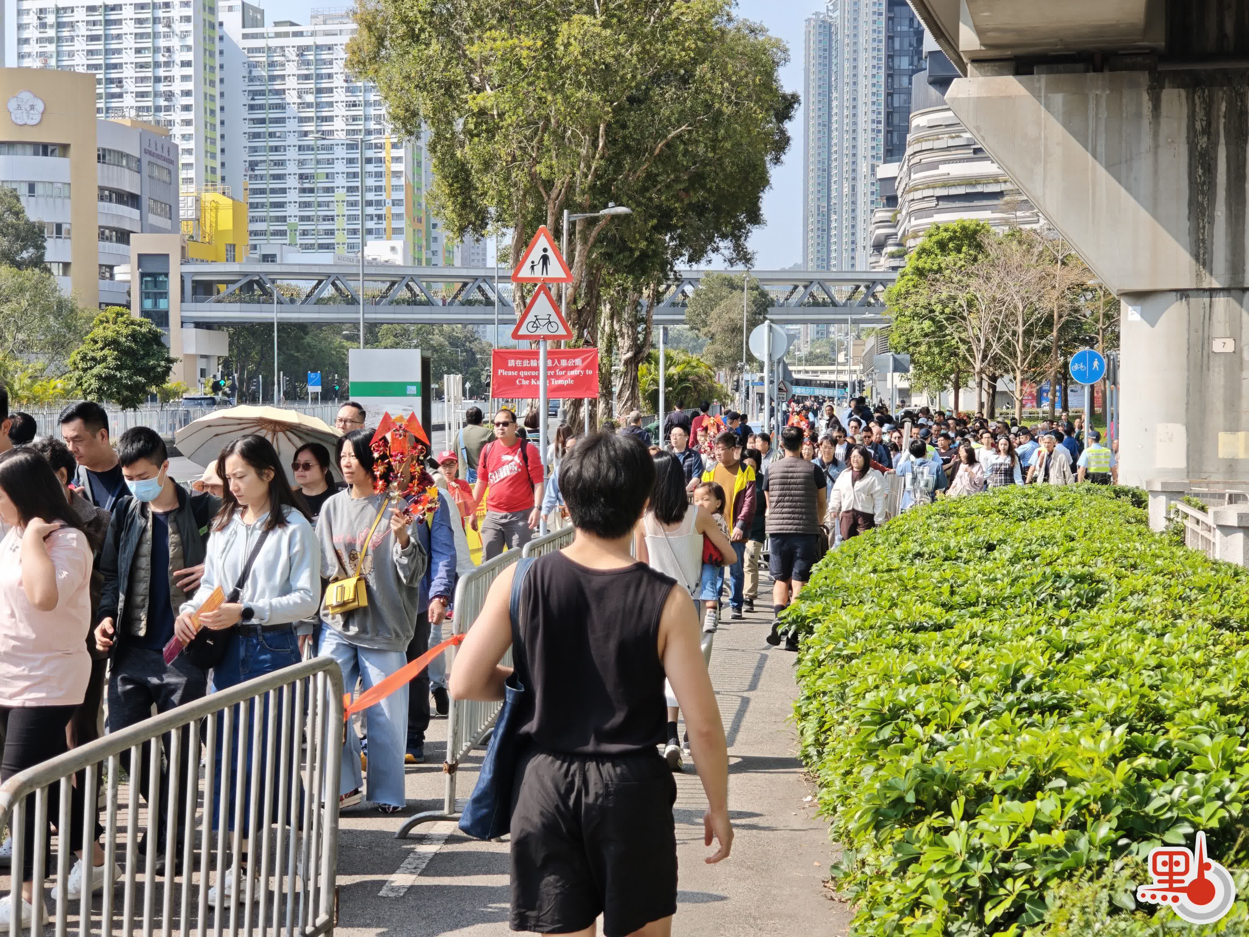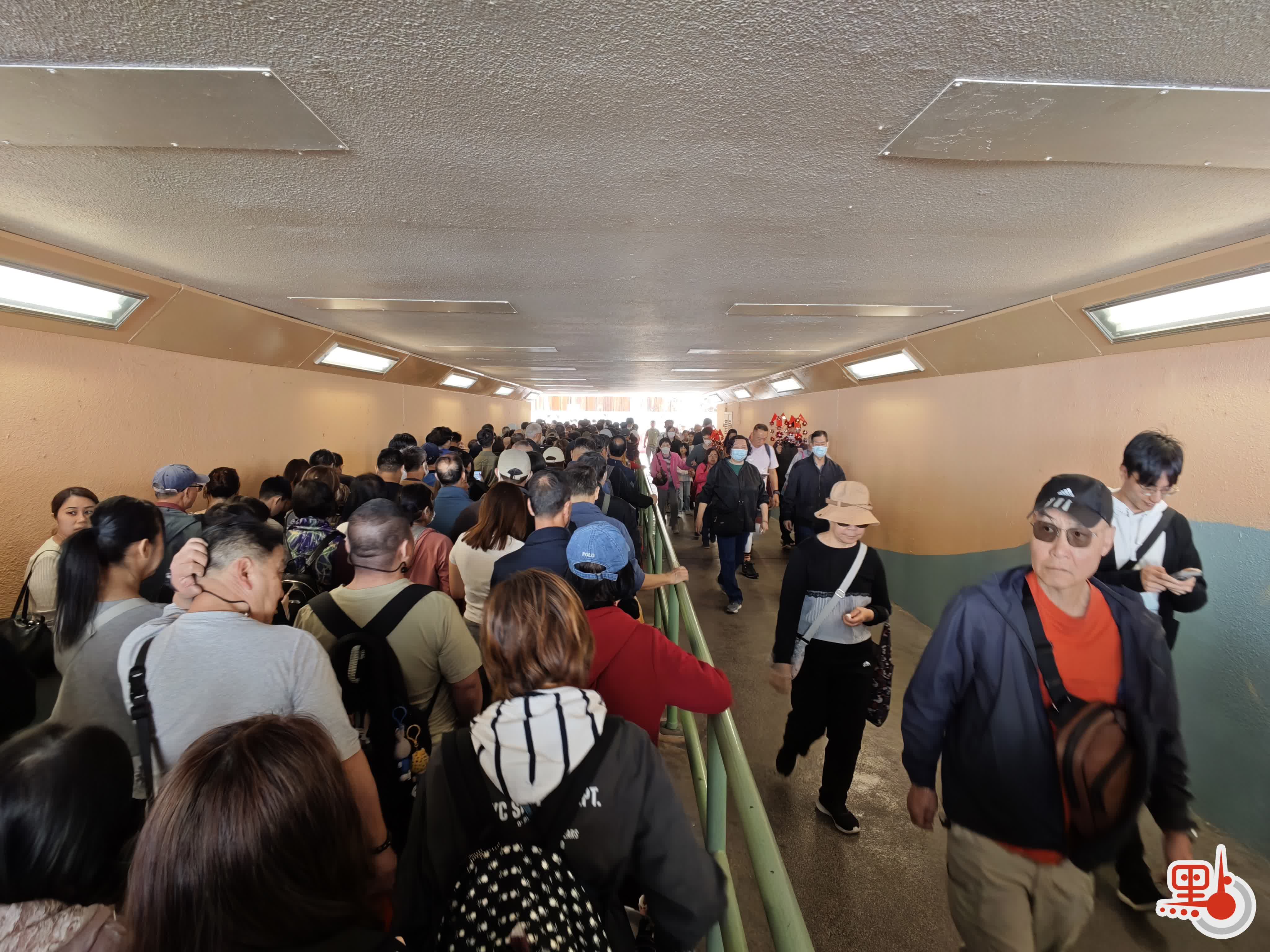 點新聞記者觀察,今早約10時排隊人龍自廟入口經車公廟路地下隧道一直排至城門河沿岸,人龍長近200米。記者亦現場實測,排隊近半小時後成功入場。