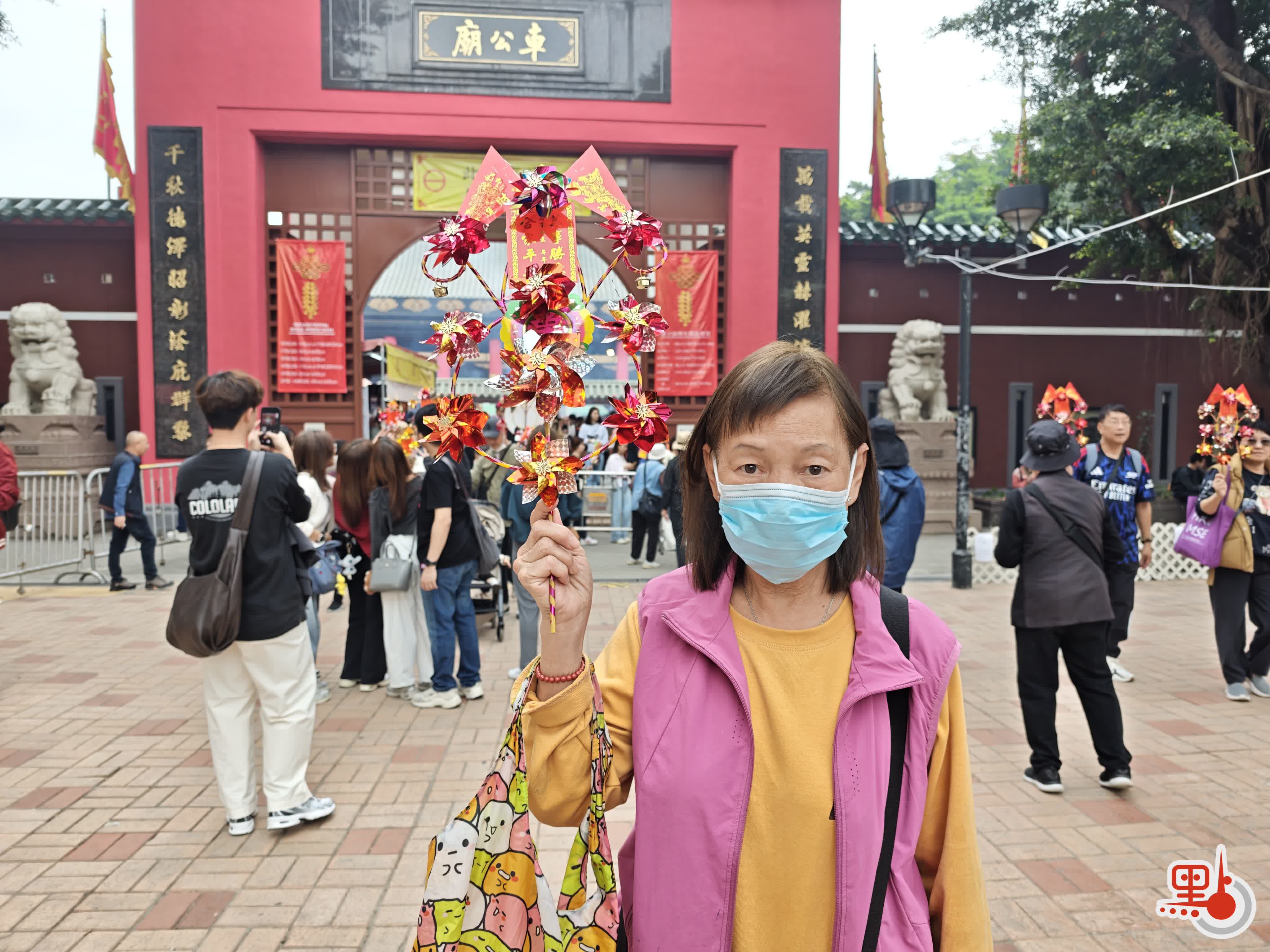 記者今早見到,車公廟外大排長龍,而廟內則人頭湧湧、氣氛熾熱,不少人都手持線香入廟參拜。市民蔡先生手捧近人高的風車和拳頭粗細的香燭,在人群中「脫穎而出」。他說,風車和香燭是其特地從車公誕市場以近2000元購入,祈願可以有一個「好好嘅運氣」。是次祈福,他說會「跟返傳統」,拜車公、攝太歲,希望香港新一年「經濟好、生意好」。