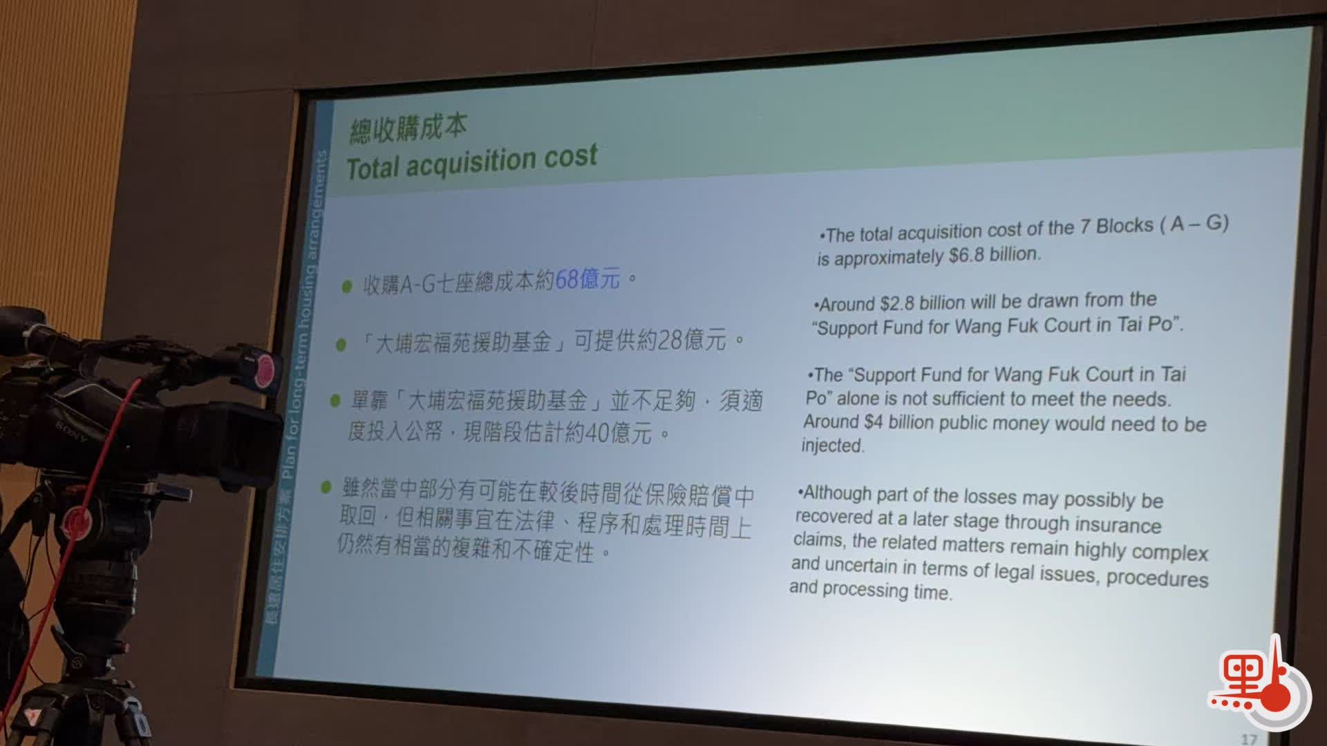 談及總收購成本,黃偉綸指,收購A至G七座樓的總成本約為68億元,大埔宏福苑援助基金可提供約28億元,單靠援助基金並不足夠,需適度投入公帑,現階段估計約為40億元。雖然當中部分有可能在較後時間從保險賠償中取回,但相關事宜在法律、程序和處理時間上仍有相當的複雜性和不確定性。