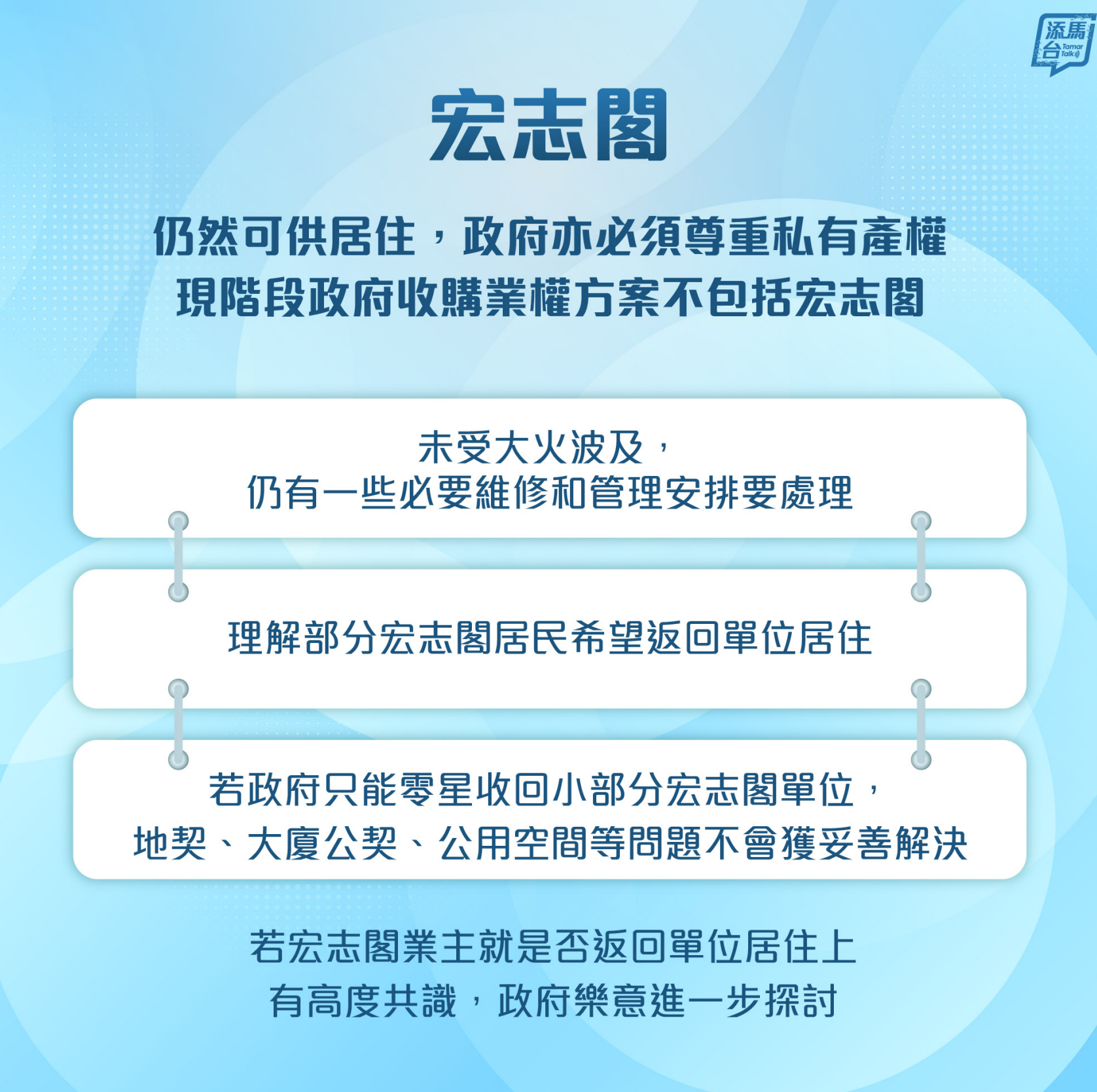 黃偉綸補充指,未被大火波及的宏志閣則不在業權收購計劃內,宏志閣目前仍可供居住,但有一些必要維修和管理安排需要處理,理解部分宏志閣居民希望返回單位居住,但若政府只能零星收回小部分宏志閣單位,地契、大廈公契、公用空間等問題難以獲妥善解決。