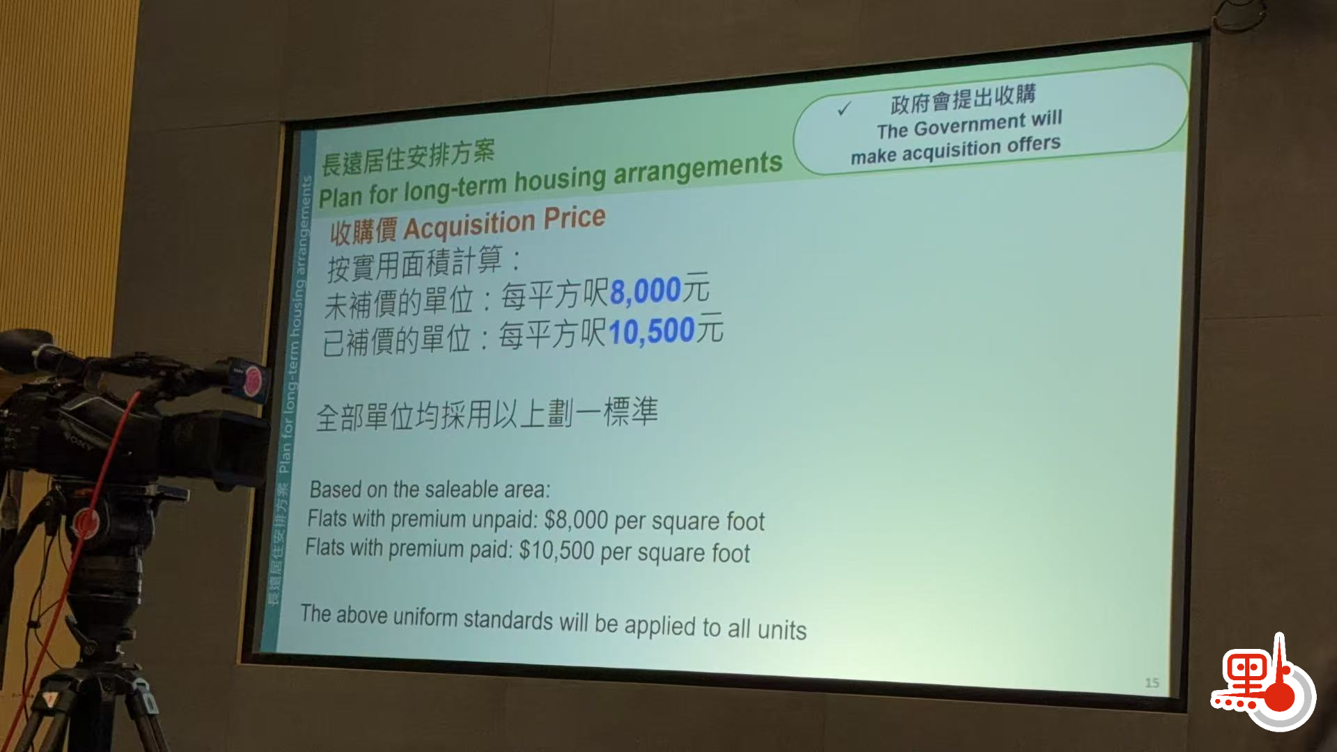 黃偉綸表示,政府會向未補價的單位業主提供每平方呎按實用面積計算的8000元收購價;而對已補價的單位,政府則提出每平方呎10500元的收購價,所有單位都將採用以上統一標準進行計算。收購業權不包括宏志閣。