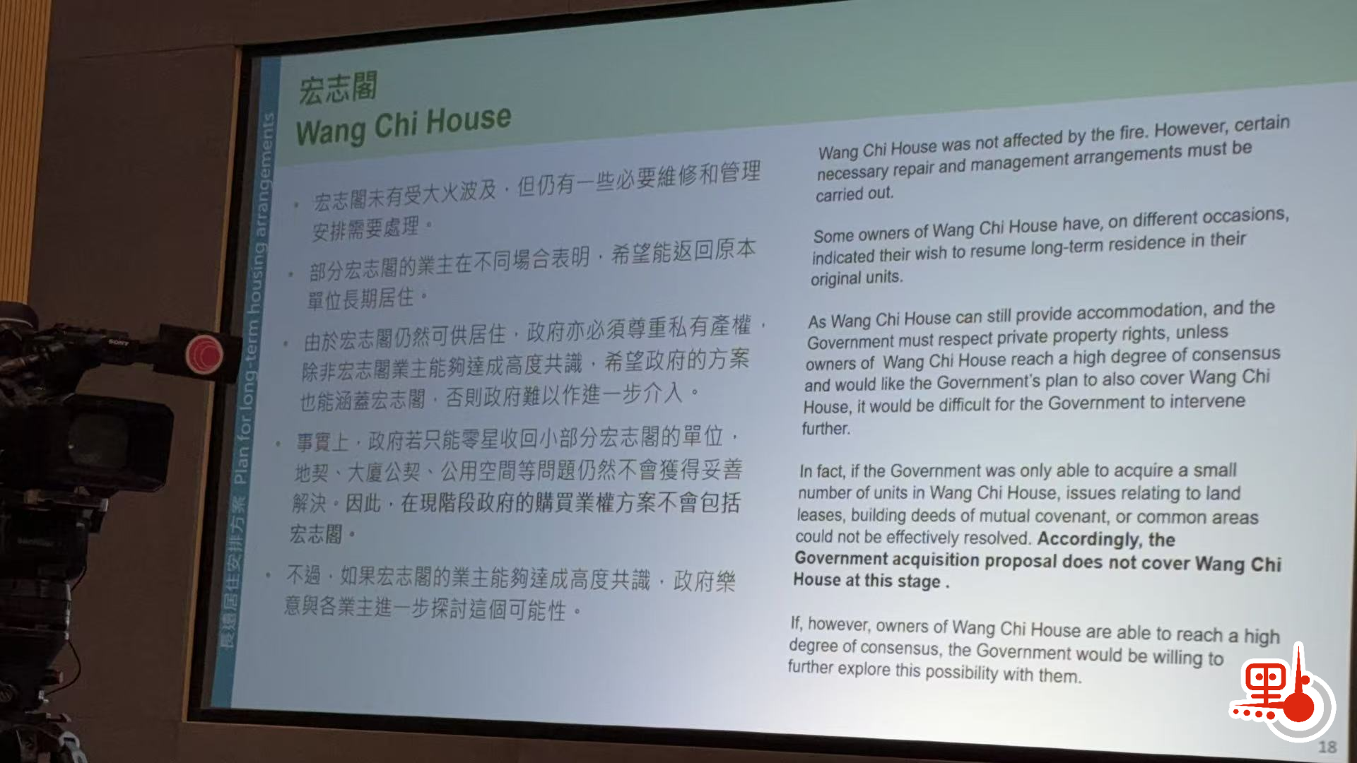 黃偉綸指出,由於目前沒有任何有效的市場機制可以幫助受災的住戶,政府因此提出用現金或者「以樓換樓」的方式收購宏福苑這7座所有單位的業權,這個方案可以最快且最靈活地解決受災業主住戶的長期居住需求,而政府成為單位的業權人之後,將承擔並處理各種法律和保險事宜方面的風險。