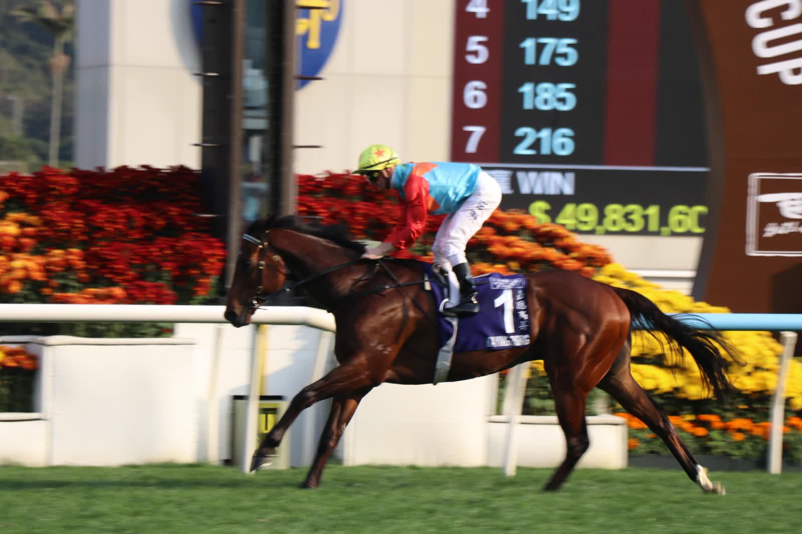 今仗「嘉應高昇」一如以往沿途居前競跑,潘頓全程按韁自若,入直路後逐步推進,約三百米處輕輕催策即迅速拉開距離,展現一貫強橫加速力,最終以無敵姿態率先衝線。值得注意的是,「嘉應高昇」今場刷新沙田1400米場地紀錄時間,造出極速1分19秒36。面對不同步速與形勢仍能持續以玩敵姿態狂勝,反映其成熟度、穩定性與實力均達無可比擬頂尖級數。