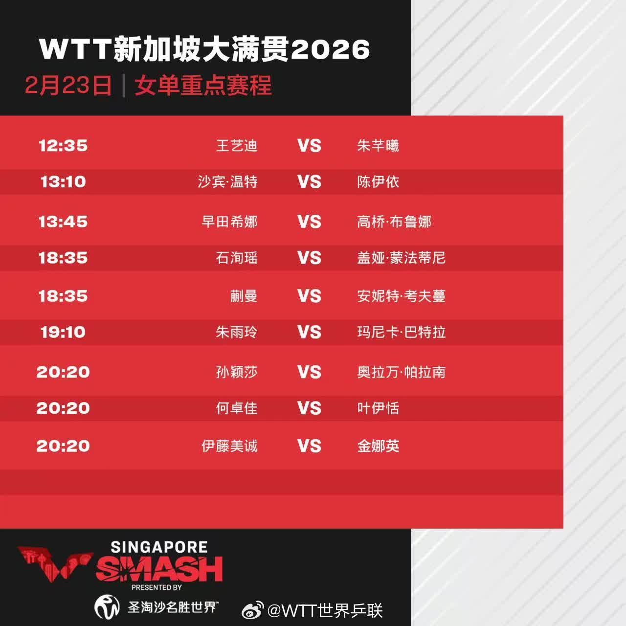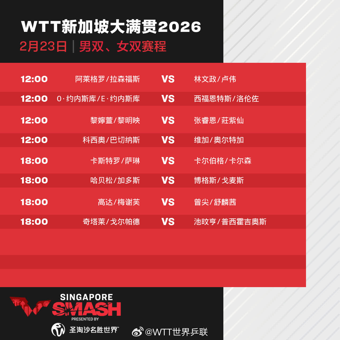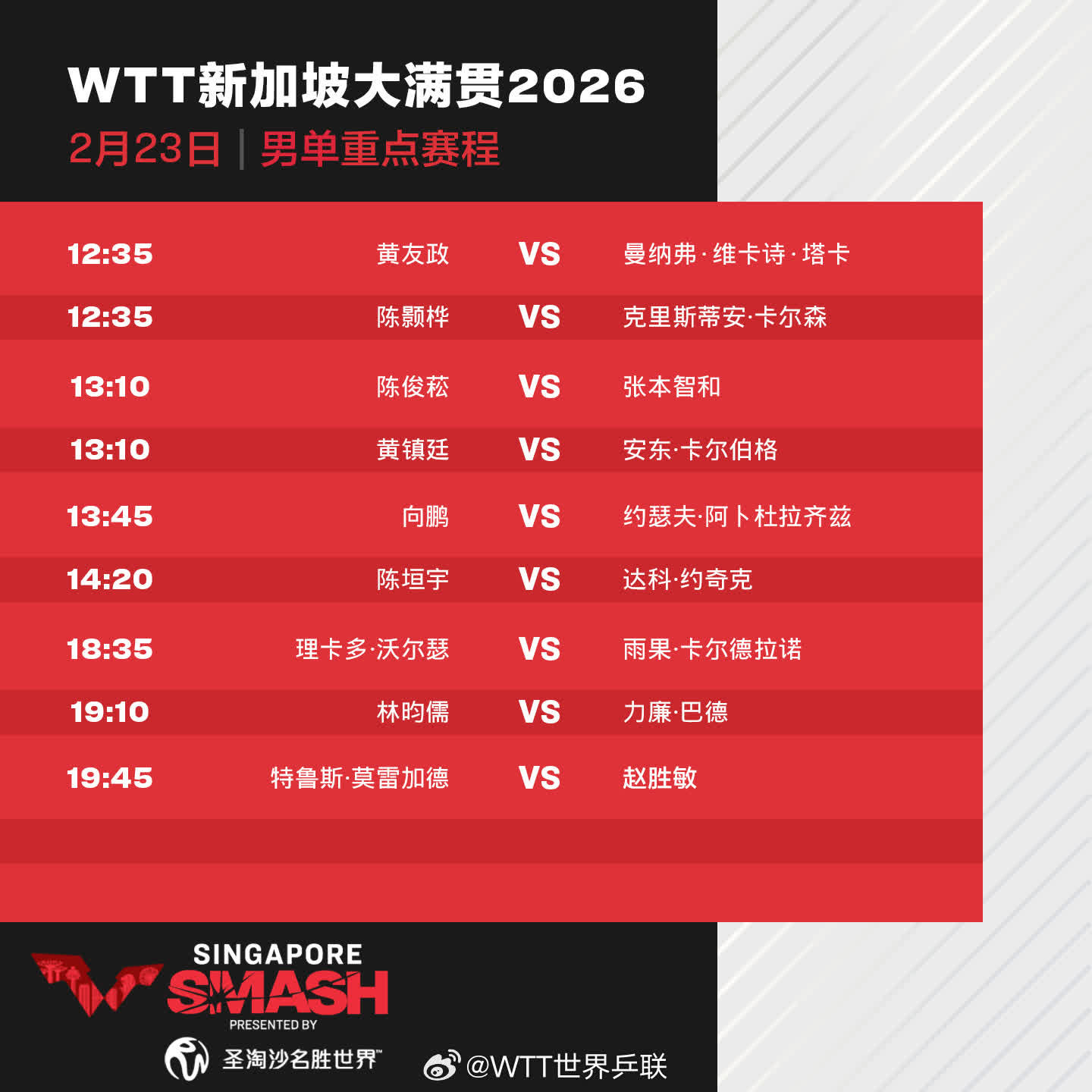 【點新聞報道】2月23日,2026年WTT新加坡大滿貫進入正賽第二天,國乒選手孫穎莎、蒯曼、王藝迪、向鵬和陳垣宇等出場。港隊方面,黃鎮廷將在男單賽事中迎戰瑞典選手安東·卡爾伯格,「黃杜配」將攜手出戰混雙,對陣瑞典組合卡爾森/C·卡爾伯格。